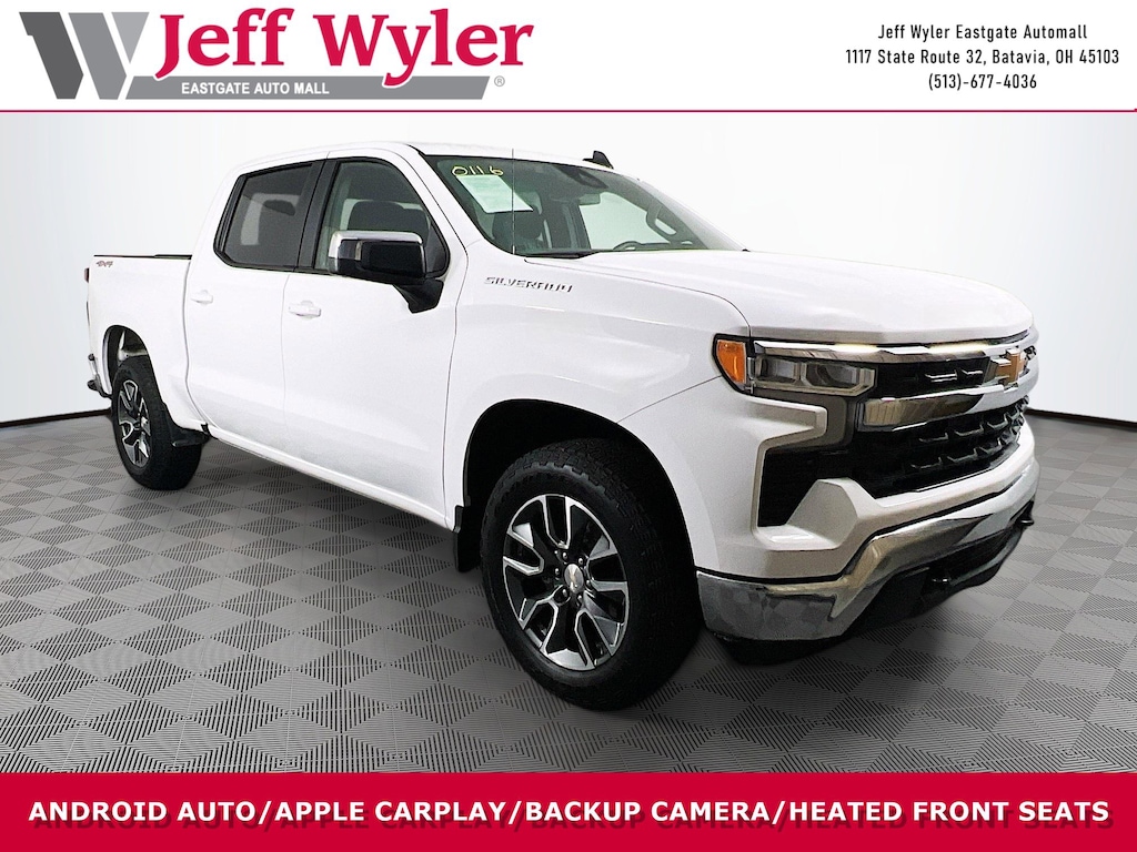 Jeff Wyler Eastgate Auto Mall is pleased to offer this charming 2024 Chevrolet Silverado 1500 LT in Summit White. Well equipped with: Convenience Package (10-Way Power Driver Seat w/Lumbar, 120-Volt Bed Mounted Power Outlet, 120-Volt Interior Power Outlet, Dual Rear USB Ports (Charge Only), Dual-Zone Automatic Climate Control, Heated Driver & Front Outboard Passenger Seats, Heated Steering Wheel, Keyless Open & Start, and Wrapped Steering Wheel), High Capacity Suspension Package, Standard Suspension Package, Trailering Package (Hitch Guidance), 12.3" Multicolor Reconfigurable Digital Display, 3.42 Rear Axle Ratio, 4-Wheel Disc Brakes, 40/20/40 Front Split-Bench Seat, 6 Speakers, 6-Speaker Audio System, ABS brakes, Air Conditioning, All-Star Edition, Alloy wheels, AM/FM radio: SiriusXM with 360L, Auto High-beam Headlights, Auto-Locking Rear Differential, Automatic Emergency Braking, Automatic temperature control, Bluetooth® For Phone, Brake assist, Bumpers: chrome, Chevrolet Connected Access Capable, Chrome Mirror Caps, Cloth Seat Trim, Color-Keyed Carpeting Floor Covering, Compass, Deep-Tinted Glass, Delay-off headlights, Driver door bin, Driver vanity mirror, Dual front impact airbags, Dual front side impact airbags, Electric Rear-Window Defogger, Electrical Steering Column Lock, Electronic Cruise Control, Electronic Stability Control, Following Distance Indicator, Forward Collision Alert, Front anti-roll bar, Front Center Armrest w/Storage, Front dual zone A/C, Front Frame-Mounted Black Recovery Hooks, Front Pedestrian Braking, Front reading lights, Front wheel independent suspension, Fully automatic headlights, HD Rear Vision Camera, Heated door mirrors, Heated front seats, Heated steering wheel, Illuminated entry, IntelliBeam Automatic High Beam On/Off, Lane Keep Assist w/Lane Departure Warning, LED Cargo Area Lighting, Low tire pressure warning, Not Equipped w/Steering Column Lock, Occupant sensing airbag, OnStar & Chevrolet Connected Services Capable, Outside temperature display, Overhead airbag, Overhead console, Panic alarm, Passenger door bin, Passenger vanity mirror, Power door mirrors, Power driver seat, Power Front Windows w/Driver Express Up/Down, Power Front Windows w/Passenger Express Down, Power Rear Windows w/Express Down, Power steering, Power windows, Premium audio system: Chevrolet Infotainment 3 Premium, Radio data system, Radio: Chevrolet Infotainment 3 Premium System, Rear 60/40 Folding Bench Seat (Folds Up), Rear reading lights, Rear step bumper, Rear window defroster, Remote keyless entry, Remote Vehicle Starter System, Security system, SiriusXM w/360L, Speed control, Speed-sensing steering, Split folding rear seat, Steering Wheel Audio Controls, Steering wheel mounted audio controls, Tachometer, Telescoping steering wheel, Theft Deterrent System (Unauthorized Entry), Tilt steering wheel, Traction control, Trip computer, Variably intermittent wipers, Voltmeter, Wheels: 18" x 8.5" Bright Silver Painted Aluminum, Wheels: 20" x 9" Painted Aluminum, and Wi-Fi Hot Spot Capable. Clean CARFAX. Certified. Chevrolet Certified Pre-Owned Details: * 172 Point Inspection * Transferable Warranty * Roadside Assistance * 24 months/24,000 miles (whichever comes first) Certified Pre-Owned Scheduled Maintenance Plan and 3 days/150 miles (whichever comes first) Vehicle Exchange Program. SiriusXM 3-month trial subscription. * Powertrain Limited Warranty: 72 Month/100,000 Mile (whichever comes first) from original in-service date * Vehicle History * Limited Warranty: 12 Month/12,000 Mile (whichever comes first) from certified purchase date * Warranty Deductible: $0Ask about available certifications. Used vehicles 10 years of age or newer with less than 100,000 miles are eligible for the Wyler Assurance Program, but eligible vehicles must pass our reconditioning process and multi-point inspection. Provided the vehicle passes inspection, vehicles will be eligible for the 6 month/6,000 mile limited warranty