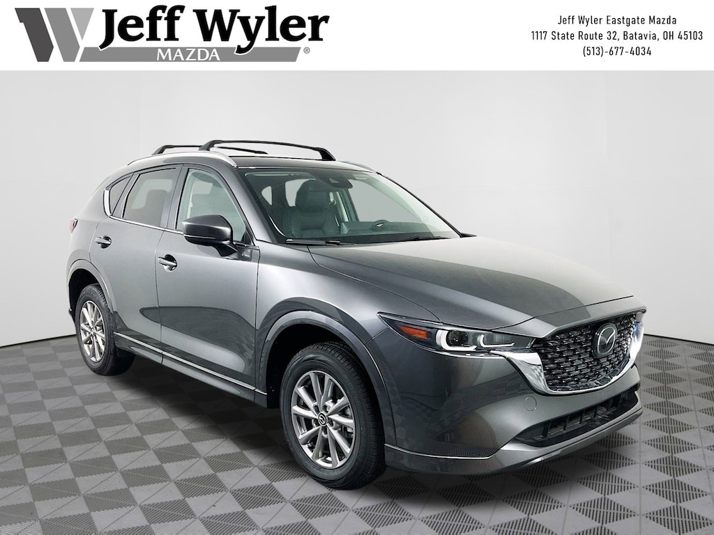 Jeff Wyler Eastgate Auto Mall is honored to offer this superb 2025 Mazda CX-5 2.5 S Select Package in Machine Gray Metallic. Well equipped with: Roof Rails & Cross Bars Package, 4-Wheel Disc Brakes, 6 Speakers, ABS brakes, Air Conditioning, Alloy wheels, AM/FM radio, AppLink/Apple CarPlay and Android Auto, Auto High-beam Headlights, Automatic temperature control, Brake assist, Bumpers: body-color, Delay-off headlights, Driver door bin, Driver vanity mirror, Dual front impact airbags, Dual front side impact airbags, E911 Automatic Emergency Notification, Electronic Stability Control, Emergency communication system: MAZDA CONNECT, Exterior Parking Camera Rear, First Aid Kit, Four wheel independent suspension, Front anti-roll bar, Front Bucket Seats, Front Center Armrest w/Storage, Front dual zone A/C, Front reading lights, Fully automatic headlights, Heated Front Bucket Seats, Heated front seats, Illuminated entry, Infotainment System Voice Command, Leather Shift Knob, Leather steering wheel, Leatherette Seat Trim, Low tire pressure warning, Machine Gray Metallic Paint, Multifunction Commander Control, Occupant sensing airbag, Outside temperature display, Overhead airbag, Overhead console, Pandora, Panic alarm, Passenger door bin, Passenger vanity mirror, Power door mirrors, Power driver seat, Power steering, Power windows, Radio Broadcast Data System Program Information, Radio data system, Radio: AM/FM/HD Audio System, Rain sensing wipers, Rear anti-roll bar, Rear Bumper Guard, Rear reading lights, Rear seat center armrest, Rear window defroster, Rear window wiper, Remote keyless entry, SMS Text Msg Audio Delivery & Reply, Speed control, Speed-sensing steering, Split folding rear seat, Spoiler, Steering wheel mounted audio controls, Tachometer, Telescoping steering wheel, Tilt steering wheel, Traction control, Trip computer, Turn signal indicator mirrors, Variably intermittent wipers, and Wheels: 17" x 7J Aluminum Alloy. Clean CARFAX. Certified. Mazda Certified Pre-Owned Details: * Vehicle History * Roadside Assistance * Transferable Warranty * Limited Warranty: 12 Month/12,000 Mile (whichever comes first) after new car warranty expires or from certified purchase date * 160 Point Inspection * Warranty Deductible: $0 * Powertrain Limited Warranty: 84 Month/100,000 Mile (whichever comes first) from original in-service date * Includes Autocheck Vehicle History Report with 3 Year Buyback Protection. 3 month SiriusXM trial subscription.Ask about available certifications. Used vehicles 10 years of age or newer with less than 100,000 miles are eligible for the Wyler Assurance Program, but eligible vehicles must pass our reconditioning process and multi-point inspection. Provided the vehicle passes inspection, vehicles will be eligible for the 6 month/6,000 mile limited warranty. The 6 month/6,000 mile limited warranty is NOT available on AS-IS vehicles, wholesale vehicles, lease buyback/pass-thru vehicles or un-inspected vehicles. Note that this program can also apply to vehicles where the remaining factory coverage is less than 6 months or 6,000 miles. Please check the Federal Trade Commission (FTC) Buyers guide on the vehicle for full details as to whether or not warranty coverage may apply. Contact Dealer for additional details. The Wyler Assurance 6 month/6,000 Mile limited warranty ends 6 months from the date of the Retail Purchase Agreement (BUYERS ORDER) or when the vehicle's odometer registers 6,000 additional miles to the mileage listed on the BUYERS ORDER, whichever comes first. Your Deductible - The warranty holder on your contract pays the first $100 of each covered repair.