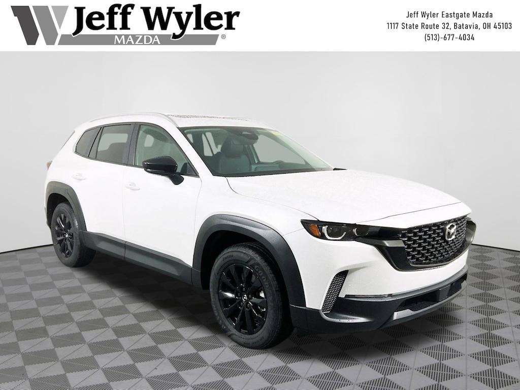 Priced below KBB Fair Purchase Price! wind chill pearl 2025 Mazda CX-50 2.5 S Premium Package SKYACTIV® 2.5L 4-Cylinder DOHC 16V AWD 6-Speed Automatic 25/31 City/Highway MPG Jeff Wyler Eastgate Auto Mall is pleased to offer this great 2025 Mazda CX-50 2.5 S Premium Package in wind chill pearl. Well equipped with: 12 Speakers, 4-Wheel Disc Brakes, ABS brakes, Air Conditioning, Alloy wheels, AM/FM radio: SiriusXM, AppLink/Apple CarPlay and Android Auto, Auto High-beam Headlights, Automatic temperature control, Black Lug Nuts & Black Wheel Locks, Brake assist, Bumpers: body-color, Carpet Cargo Mat, Delay-off headlights, Driver door bin, Driver vanity mirror, Dual front impact airbags, Dual front side impact airbags, Electronic Stability Control, Emergency communication system: MAZDA CONNECT, Exterior Parking Camera Rear, Front anti-roll bar, Front Bucket Seats, Front Center Armrest, Front dual zone A/C, Front reading lights, Front wheel independent suspension, Fully automatic headlights, Half Leatherette Seat Trim, Heated door mirrors, Heated front seats, Heated Front Seats w/3 Level Adjustment, Illuminated entry, Knee airbag, Leather Shift Knob, Leather steering wheel, Low tire pressure warning, Occupant sensing airbag, Outside temperature display, Overhead airbag, Overhead console, Panic alarm, Passenger door bin, Passenger vanity mirror, Power door mirrors, Power driver seat, Power Liftgate, Power moonroof, Power steering, Power windows, Radio data system, Radio: AM/FM/HD Bose 12-Speaker Audio Sound System, Rain sensing wipers, Rear seat center armrest, Rear window defroster, Rear window wiper, Remote keyless entry, Speed control, Speed-sensing steering, Split folding rear seat, Spoiler, Steering wheel mounted audio controls, Tachometer, Telescoping steering wheel, Tilt steering wheel, Traction control, Trip computer, Turn signal indicator mirrors, Variably intermittent wipers, Wheels: 17" x 7J Aluminum Alloy Black Metallic Finish, and Wind Chill Pearl Paint Charge. 25/31 City/Highway MPG Price includes: $1000 - Customer Cash. Exp. 01/02/2026