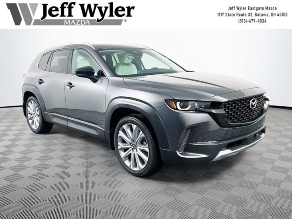 Machine Gray Metallic 2026 Mazda CX-50 2.5 Turbo 2.5L I4 Turbocharged DOHC 16V LEV3-ULEV70 227hp AWD 6-Speed Automatic 23/29 City/Highway MPG Jeff Wyler Eastgate Auto Mall is proud to offer this charming 2026 Mazda CX-50 2.5 Turbo in Machine Gray Metallic. Well equipped with: 12 Speakers, 4-Wheel Disc Brakes, ABS brakes, Air Conditioning, Alloy wheels, AM/FM radio: SiriusXM, AppLink/Apple CarPlay and Android Auto, Auto High-beam Headlights, Auto-dimming Rear-View mirror, Automatic temperature control, Brake assist, Bumpers: body-color, Carpet Cargo Mat, Delay-off headlights, Driver door bin, Driver vanity mirror, Dual front impact airbags, Dual front side impact airbags, Electronic Stability Control, Emergency communication system: MAZDA CONNECT, Exterior Parking Camera Rear, Front and Rear Splash Guards, Front anti-roll bar, Front Bucket Seats, Front Center Armrest, Front dual zone A/C, Front reading lights, Front wheel independent suspension, Fully automatic headlights, Garage door transmitter: HomeLink, Heads-Up Display, Heated and Ventilated Front Seats with 3 Level Adjustment, Heated door mirrors, Heated front seats, Illuminated entry, Knee airbag, Leather Seat Trim, Leather Shift Knob, Leather steering wheel, Low tire pressure warning, Machine Gray Metallic and White Interior, Memory seat, Occupant sensing airbag, Outside temperature display, Overhead airbag, Overhead console, Panic alarm, Passenger door bin, Passenger vanity mirror, Power door mirrors, Power driver seat, Power Liftgate, Power moonroof, Power passenger seat, Power steering, Power windows, Radio data system, Radio: AM/FM/HD Bose 12-Speaker Audio Sound System, Rain sensing wipers, Rear seat center armrest, Rear window defroster, Rear window wiper, Remote keyless entry, Speed control, Speed-sensing steering, Split folding rear seat, Spoiler, Steering wheel mounted audio controls, Tachometer, Telescoping steering wheel, Tilt steering wheel, Traction control, Trailer Hitch with 7-Pin Harness, Trip computer, Turn signal indicator mirrors, Variably intermittent wipers, Ventilated front seats, and Wheels: 20 x 8J Aluminum Alloy Black Metallic with Machining Cut. 23/29 City/Highway MPG Price includes: $1500 - Customer Cash. Exp. 03/31/2026