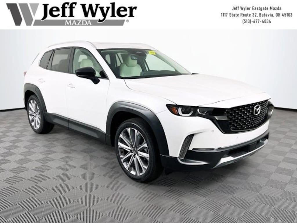 Priced below KBB Fair Purchase Price! Wind Chill Pearl 2026 Mazda CX-50 2.5 Turbo 2.5L I4 Turbocharged DOHC 16V LEV3-ULEV70 227hp AWD 6-Speed Automatic 23/29 City/Highway MPG Jeff Wyler Eastgate Auto Mall is pumped up to offer this handsome 2026 Mazda CX-50 2.5 Turbo in Wind Chill Pearl. Well equipped with: Weather Package, 12 Speakers, 4-Wheel Disc Brakes, ABS brakes, Air Conditioning, Alloy wheels, AM/FM radio: SiriusXM, AppLink/Apple CarPlay and Android Auto, Auto High-beam Headlights, Auto-dimming Rear-View mirror, Automatic temperature control, Brake assist, Bumpers: body-color, Delay-off headlights, Driver door bin, Driver vanity mirror, Dual front impact airbags, Dual front side impact airbags, Electronic Stability Control, Emergency communication system: MAZDA CONNECT, Exterior Parking Camera Rear, Front anti-roll bar, Front Bucket Seats, Front Center Armrest, Front dual zone A/C, Front reading lights, Front wheel independent suspension, Fully automatic headlights, Garage door transmitter: HomeLink, Heads-Up Display, Heated and Ventilated Front Seats with 3 Level Adjustment, Heated door mirrors, Heated front seats, Illuminated entry, Knee airbag, Leather Seat Trim, Leather Shift Knob, Leather steering wheel, Low tire pressure warning, Memory seat, Occupant sensing airbag, Outside temperature display, Overhead airbag, Overhead console, Panic alarm, Passenger door bin, Passenger vanity mirror, Power door mirrors, Power driver seat, Power Liftgate, Power moonroof, Power passenger seat, Power steering, Power windows, Radio data system, Radio: AM/FM/HD Bose 12-Speaker Audio Sound System, Rain sensing wipers, Rear seat center armrest, Rear window defroster, Rear window wiper, Remote keyless entry, Speed control, Speed-sensing steering, Split folding rear seat, Spoiler, Steering wheel mounted audio controls, Tachometer, Telescoping steering wheel, Tilt steering wheel, Traction control, Trip computer, Turn signal indicator mirrors, Variably intermittent wipers, Ventilated front seats, Wheels: 20 x 8J Aluminum Alloy Black Metallic with Machining Cut, and Wind Chill Pearl and White Interior. 23/29 City/Highway MPG Price includes: $1500 - Customer Cash. Exp. 03/31/2026