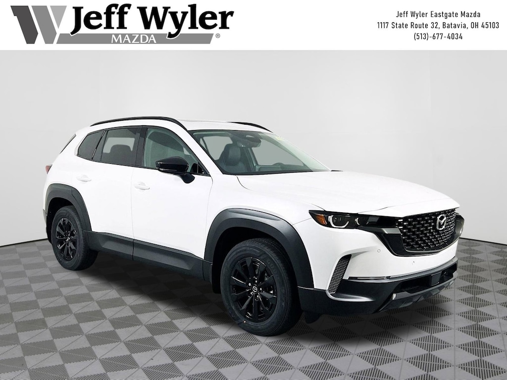wind chill pearl 2026 Mazda CX-50 Hybrid Premium 2.5L 4-Cylinder AWD CVT 39/37 City/Highway MPG Jeff Wyler Eastgate Auto Mall is pumped up to offer this stunning 2026 Mazda CX-50 Hybrid Premium in wind chill pearl. Well equipped with: 12 Speakers, 4-Wheel Disc Brakes, ABS brakes, Air Conditioning, Alloy wheels, AM/FM radio: SiriusXM, AppLink/Apple CarPlay and Android Auto, Auto High-beam Headlights, Auto-dimming Rear-View mirror, Automatic temperature control, Brake assist, Bumpers: body-color, Carpet Cargo Mat, Delay-off headlights, Driver door bin, Driver vanity mirror, Dual front impact airbags, Dual front side impact airbags, Electronic Stability Control, Emergency communication system: MAZDA CONNECT, Exterior Parking Camera Rear, Front and Rear Splash Guards, Front anti-roll bar, Front Bucket Seats, Front Center Armrest, Front dual zone A/C, Front reading lights, Front wheel independent suspension, Fully automatic headlights, Heated and Ventilated Front Seats with 3 Level Adjustment, Heated door mirrors, Heated front seats, Illuminated entry, Knee airbag, Leather Seat Trim, Leather Shift Knob, Leather steering wheel, Life Style Mount, Low tire pressure warning, Memory seat, Occupant sensing airbag, Outside temperature display, Overhead airbag, Overhead console, Panic alarm, Passenger door bin, Passenger vanity mirror, Power door mirrors, Power driver seat, Power Liftgate, Power moonroof, Power passenger seat, Power steering, Power windows, Radio data system, Radio: AM/FM/HD Bose 12-Speaker Audio Sound System, Rain sensing wipers, Rear seat center armrest, Rear window defroster, Rear window wiper, Remote keyless entry, Speed control, Speed-sensing steering, Split folding rear seat, Spoiler, Steering wheel mounted audio controls, Tachometer, Telescoping steering wheel, Tilt steering wheel, Traction control, Trip computer, Turn signal indicator mirrors, Variably intermittent wipers, Ventilated front seats, Wheels: 17" x 7J Aluminum Alloy Black Metallic Finish, and Wind Chill Pearl Paint Charge. 39/37 City/Highway MPG