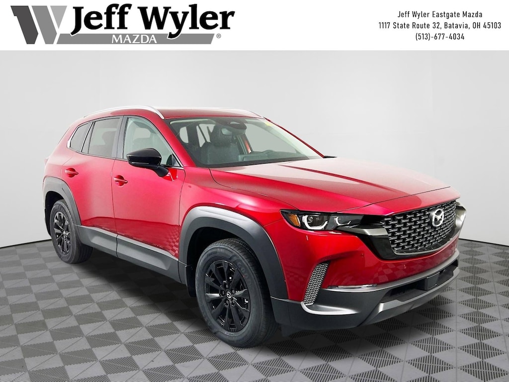 soul red crystal metallic 2026 Mazda CX-50 Hybrid Preferred 2.5L 4-Cylinder AWD CVT 39/37 City/Highway MPG Jeff Wyler Eastgate Auto Mall is pumped up to offer this attractive 2026 Mazda CX-50 Hybrid Preferred in soul red crystal metallic. Well equipped with: Cargo Package, 4-Wheel Disc Brakes, 8 Speakers, ABS brakes, Air Conditioning, Alloy wheels, AM/FM radio, AppLink/Apple CarPlay and Android Auto, Auto High-beam Headlights, Automatic temperature control, Black Lug Nuts and Black Wheel Locks, Brake assist, Bumpers: body-color, Delay-off headlights, Driver door bin, Driver vanity mirror, Dual front impact airbags, Dual front side impact airbags, Electronic Stability Control, Emergency communication system: MAZDA CONNECT, Exterior Parking Camera Rear, Front and Rear Splash Guards, Front anti-roll bar, Front Bucket Seats, Front Center Armrest, Front dual zone A/C, Front reading lights, Front wheel independent suspension, Fully automatic headlights, Half Leatherette Seat Trim, Heated door mirrors, Heated Front Bucket Seats, Heated front seats, Illuminated entry, Knee airbag, Leather Shift Knob, Leather steering wheel, Low tire pressure warning, Occupant sensing airbag, Outside temperature display, Overhead airbag, Overhead console, Panic alarm, Passenger door bin, Passenger vanity mirror, Power door mirrors, Power driver seat, Power Liftgate, Power moonroof, Power steering, Power windows, Radio data system, Radio: AM/FM/HD 8-Speaker Audio Sound System, Rain sensing wipers, Rear seat center armrest, Rear window defroster, Rear window wiper, Remote keyless entry, Soul Red Crystal Metallic Paint Charge, Speed control, Speed-sensing steering, Split folding rear seat, Spoiler, Steering wheel mounted audio controls, Tachometer, Telescoping steering wheel, Tilt steering wheel, Traction control, Trip computer, Turn signal indicator mirrors, Variably intermittent wipers, and Wheels: 17" x 7J Aluminum Alloy Black Metallic Finish. 39/37 City/Highway MPG