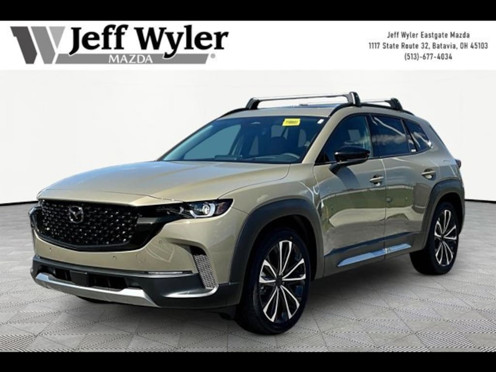 Zircon Sand Metallic 2026 Mazda CX-50 2.5 Turbo Premium Plus 2.5L I4 Turbocharged DOHC 16V LEV3-ULEV70 227hp AWD 6-Speed Automatic 23/29 City/Highway MPG Jeff Wyler Eastgate Auto Mall is proud to offer this fantastic-looking 2026 Mazda CX-50 2.5 Turbo Premium Plus in Zircon Sand Metallic. Well equipped with: Accent Package, Cargo Package, 12 Speakers, 4-Wheel Disc Brakes, ABS brakes, Air Conditioning, Alloy wheels, AM/FM radio: SiriusXM, AppLink/Apple CarPlay and Android Auto, Auto High-beam Headlights, Auto-dimming door mirrors, Auto-dimming Rear-View mirror, Automatic temperature control, Black Lug Nuts and Black Wheel Locks, Brake assist, Bumpers: body-color, Carpet Cargo Mat, Compass, Delay-off headlights, Driver door bin, Driver vanity mirror, Dual front impact airbags, Dual front side impact airbags, Electronic Stability Control, Emergency communication system: MAZDA CONNECT, Front anti-roll bar, Front Bucket Seats, Front Center Armrest, Front dual zone A/C, Front reading lights, Front wheel independent suspension, Fully automatic headlights, Garage door transmitter: HomeLink, Heads-Up Display, Heated and Ventilated Front Seats with 3 Level Adjustment, Heated door mirrors, Heated front seats, Heated rear seats, Heated steering wheel, Illuminated entry, Knee airbag, Leather Seat Trim, Leather Shift Knob, Leather steering wheel, Low tire pressure warning, Memory seat, Navigation system: MAZDA CONNECT, Occupant sensing airbag, Outside temperature display, Overhead airbag, Overhead console, Panic alarm, Passenger door bin, Passenger vanity mirror, Power door mirrors, Power driver seat, Power Liftgate, Power moonroof, Power passenger seat, Power steering, Power windows, Radio data system, Radio: AM/FM/HD Bose 12-Speaker Audio Sound System and Navigation, Rain sensing wipers, Rear seat center armrest, Rear window defroster, Rear window wiper, Remote keyless entry, Silver Cross Bars, Speed control, Speed-sensing steering, Split folding rear seat, Spoiler, Steering wheel mounted audio controls, Tachometer, Telescoping steering wheel, Tilt steering wheel, Traction control, Trip computer, Turn signal indicator mirrors, Variably intermittent wipers, Ventilated front seats, Wheels: 20 x 8J Aluminum Alloy Black Metallic with Machining Cut, and Zircon Sand Metallic Paint Charge. 23/29 City/Highway MPG Price includes: $1500 - Customer Cash. Exp. 04/30/2026