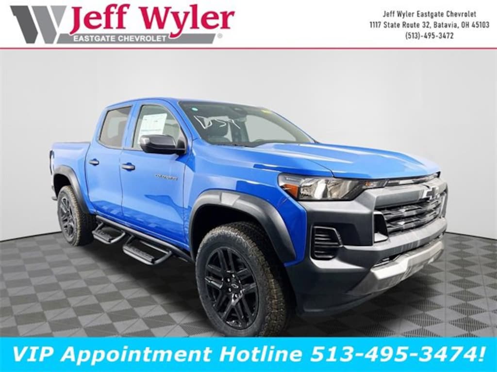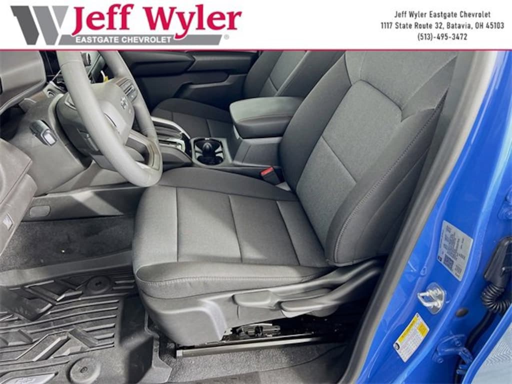 Reef Blue Metallic 2025 Chevrolet Colorado Trail Boss 2.7L I4 Turbocharged DOHC 16V LEV3-ULEV50 310hp 4WD 8-Speed Automatic 18/23 City/Highway MPG Jeff Wyler Eastgate Auto Mall is very proud to offer this outstanding-looking 2025 Chevrolet Colorado Trail Boss in Reef Blue Metallic. Well equipped with: Preferred Equipment Group 0TR (Automatic Emergency Braking, Chevy Safety Assist, Following Distance Indicator, Forward Collision Alert, Front Pedestrian & Bicyclist Braking, IntelliBeam Automatic High Beam On/Off, and Lane Keep Assist w/Lane Departure Warning), 1st & 2nd Row All-Weather Floor Liner (LPO), 3.42 Rear Axle Ratio, 4-Way Manual Passenger Seat Adjuster, 4-Wheel Disc Brakes, 6 Speakers, 6-Speaker Audio System Feature, 6-Way Manual Driver Seat Adjuster, ABS brakes, Air Conditioning, Alloy wheels, AM/FM radio: SiriusXM, Apple CarPlay/Android Auto, Auto High-beam Headlights, Automatic temperature control, Brake assist, Cloth Seat Trim, Compass, Delay-off headlights, Driver door bin, Driver vanity mirror, Dual front impact airbags, Dual front side impact airbags, Electronic Stability Control, Emergency communication system: OnStar, Front anti-roll bar, Front Bucket Seats, Front Center Armrest, Front dual zone A/C, Front wheel independent suspension, Heated door mirrors, Illuminated entry, Low tire pressure warning, Navigation System, Occupant sensing airbag, Outside temperature display, Overhead airbag, Overhead console, Panic alarm, Passenger door bin, Passenger vanity mirror, Power door mirrors, Power steering, Power windows, Radio data system, Radio: 11.3 Diagonal Advanced Color LCD Display, Rear reading lights, Rear step bumper, Rear window defroster, Remote keyless entry, Removable Front & Rear Off-Road Assist Steps (LPO), Rocker Panel Protector (LPO), Security system, SiriusXM Trial Subscription, Speed control, Speed-sensing steering, Split folding rear seat, Steering Wheel Mounted Audio Controls, Steering wheel mounted audio controls, Tachometer, Tilt steering wheel, Traction control, Trip computer, Variably intermittent wipers, Wheels: 18 x 8.5 Black High Gloss Aluminum, Wheels: 20 x 9 High Gloss Black Aluminum, and Wireless Phone Projection. Price includes: $500 - Chevrolet Consumer Cash Program. Exp. 01/02/2026