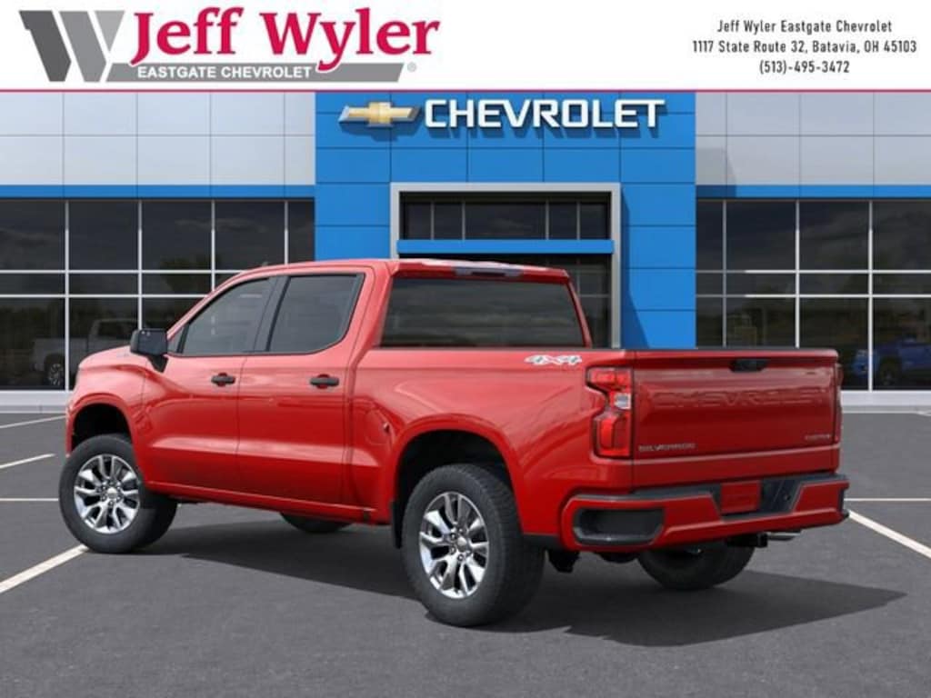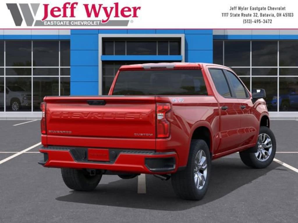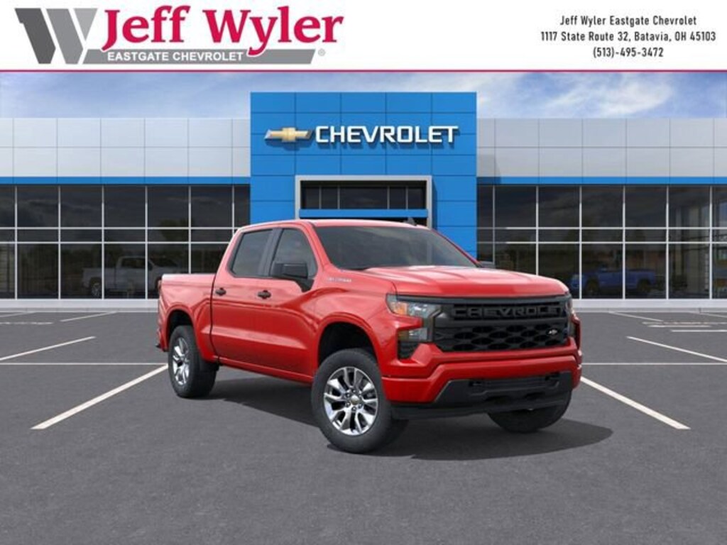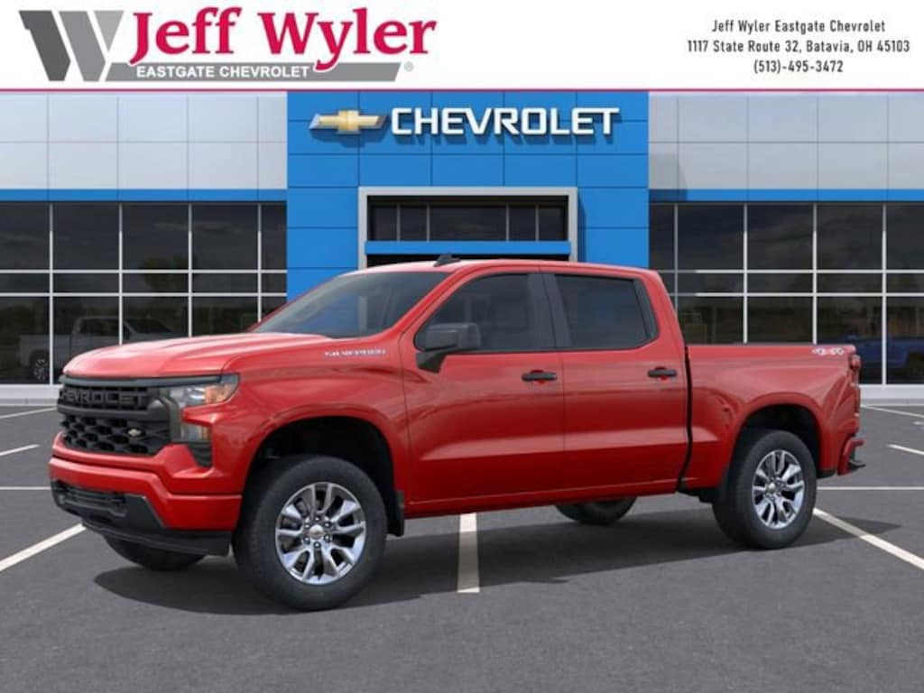 Red 2026 Chevrolet Silverado 1500 Custom 2.7L I4 Turbocharged DOHC 16V LEV3-SULEV30 310hp 4WD 8-Speed Automatic 17/21 City/Highway MPG Jeff Wyler Eastgate Auto Mall is proud to offer this handsome 2026 Chevrolet Silverado 1500 Custom in Red. Well equipped with: Custom Convenience Package (Electric Rear-Window Defogger, EZ Lift Power Lock and Release Tailgate, LED Cargo Area Lighting, Remote Vehicle Starter System, and Theft Deterrent System (unauthorized Entry)), Custom Value Package, High Capacity Suspension Package, Trailering Package (Hitch Guidance), 10-Way Power Driver Seat with Lumbar, 120-Volt Bed Mounted Power Outlet, 120-Volt Interior Power Outlet, 3.42 Rear Axle Ratio, 3.5 Monochromatic Display Driver Info Center, 4-Wheel Disc Brakes, 40/20/40 Front Split-Bench Seat, 6 Speakers, 6-Speaker Audio System, ABS brakes, Air Conditioning, Alloy wheels, AM/FM radio: SiriusXM, Apple CarPlay/Android Auto, Auto High-beam Headlights, Automatic Emergency Braking, Bluetooth® For Phone, Brake assist, Bumpers: body-color, Cloth Seat Trim, Color-Keyed Carpeting Floor Covering, Compass, Deep-Tinted Glass, Delay-off headlights, Driver door bin, Driver vanity mirror, Dual front impact airbags, Dual front side impact airbags, Dual Rear USB Ports (charge Only), Electronic Cruise Control, Electronic Stability Control, Emergency communication system: OnStar, Following Distance Indicator, Forward Collision Alert, Front anti-roll bar, Front Center Armrest w/Storage, Front Frame-Mounted Black Recovery Hooks, Front Pedestrian Braking, Front reading lights, Front Rubberized Vinyl Floor Mats, Front wheel independent suspension, Fully automatic headlights, HD Rear Vision Camera, Heated door mirrors, Illuminated entry, IntelliBeam Automatic High Beam on/Off, Lane Keep Assist with Lane Departure Warning, Low tire pressure warning, Manual Tilt Wheel Steering Column, Occupant sensing airbag, OnStar Services Capable, Outside temperature display, Overhead airbag, Overhead console, Panic alarm, Passenger door bin, Passenger vanity mirror, Power door mirrors, Power driver seat, Power Front Windows with Driver Express Up/Down, Power Front Windows with Passenger Express Down, Power Rear Windows with Express Down, Power steering, Power windows, Premium audio system: Chevrolet Infotainment 3, Radio data system, Radio: Chevrolet Infotainment 3 System, Rear 60/40 Folding Bench Seat (folds Up), Rear reading lights, Rear Rubberized-Vinyl Floor Mats, Rear step bumper, Rear window defroster, Remote Keyless Entry, Remote keyless entry, Security system, SiriusXM Trial Subscription, Speed control, Speed-sensing steering, Split folding rear seat, Standard Tailgate, Tachometer, Teen Driver, Tilt steering wheel, Tire Pressure Monitoring System, Traction control, Trip computer, Variably intermittent wipers, Voltmeter, Wheels: 20 x 9 Bright Silver Painted Aluminum, and Wi-Fi Hot Spot Capable. Price includes: $2000 - Chevrolet Consumer Cash Program. Exp. 04/30/2026