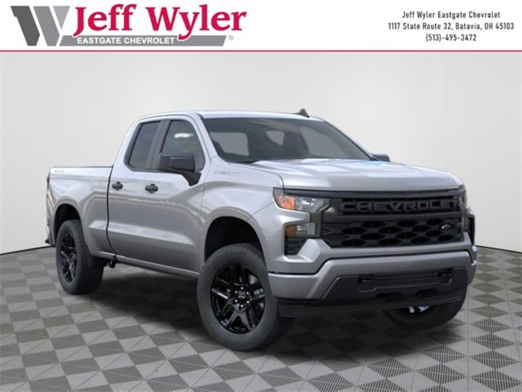 Priced below KBB Fair Purchase Price! Sterling Gray Metallic 2026 Chevrolet Silverado 1500 Custom 2.7L I4 Turbocharged DOHC 16V LEV3-SULEV30 310hp 4WD 8-Speed Automatic 17/21 City/Highway MPG Jeff Wyler Eastgate Auto Mall is honored to offer this gorgeous 2026 Chevrolet Silverado 1500 Custom in Sterling Gray Metallic. Well equipped with: Custom Convenience Package (Electric Rear-Window Defogger, EZ Lift Power Lock and Release Tailgate, LED Cargo Area Lighting, Remote Vehicle Starter System, and Theft Deterrent System (unauthorized Entry)), Custom Value Package, Dark Essentials Package (Black Name Plates, Black Tailgate CHEVROLET Lettering, and Front Black Bowtie Emblem), High Capacity Suspension Package, Preferred Equipment Group 1CX (10-Way Power Driver Seat with Lumbar, 120-Volt Bed Mounted Power Outlet, 120-Volt Interior Power Outlet, 3.5 Monochromatic Display Driver Info Center, 40/20/40 Front Split-Bench Seat, Bluetooth® For Phone, Cloth Seat Trim, Color-Keyed Carpeting Floor Covering, Deep-Tinted Glass, Dual Rear USB Ports (charge Only), Electronic Cruise Control, Front Frame-Mounted Black Recovery Hooks, Front Rubberized Vinyl Floor Mats, HD Rear Vision Camera, Manual Tilt Wheel Steering Column, OnStar Services Capable, Power Front Windows with Driver Express Up/Down, Power Front Windows with Passenger Express Down, Power Rear Windows with Express Down, Rear 60/40 Folding Bench Seat (folds Up), Rear Rubberized-Vinyl Floor Mats, Remote Keyless Entry, SiriusXM Trial Subscription, Standard Tailgate, Teen Driver, Tire Pressure Monitoring System, and Wi-Fi Hot Spot Capable), Trailering Package (Hitch Guidance), 3.42 Rear Axle Ratio, 4-Wheel Disc Brakes, 6 Speakers, 6-Speaker Audio System, ABS brakes, Air Conditioning, All-Weather Floor Liner, Alloy wheels, AM/FM radio: SiriusXM, Apple CarPlay/Android Auto, Auto High-beam Headlights, Automatic Emergency Braking, Brake assist, Bumpers: body-color, Chevytec Spray-on Black Bedliner, Compass, Delay-off headlights, Driver door bin, Driver vanity mirror, Dual front impact airbags, Dual front side impact airbags, Electronic Stability Control, Emergency communication system: OnStar, Following Distance Indicator, Forward Collision Alert, Front anti-roll bar, Front Center Armrest w/Storage, Front Pedestrian Braking, Front reading lights, Front wheel independent suspension, Fully automatic headlights, Heated door mirrors, Illuminated entry, IntelliBeam Automatic High Beam on/Off, Lane Keep Assist with Lane Departure Warning, Low tire pressure warning, Occupant sensing airbag, Outside temperature display, Overhead airbag, Overhead console, Panic alarm, Passenger door bin, Passenger vanity mirror, Power door mirrors, Power driver seat, Power steering, Power windows, Premium audio system: Chevrolet Infotainment 3, Radio data system, Radio: Chevrolet Infotainment 3 System, Rear reading lights, Rear step bumper, Rear window defroster, Remote keyless entry, Security system, Speed control, Speed-sensing steering, Split folding rear seat, Tachometer, Tilt steering wheel, Traction control, Trip computer, Variably intermittent wipers, Voltmeter, Wheels: 20 x 9 Bright Silver Painted Aluminum, and Wheels: 20 x 9 High Gloss Black Painted Aluminum. Price includes: $3000 - Chevrolet Consumer Cash Program. Exp. 03/31/2026