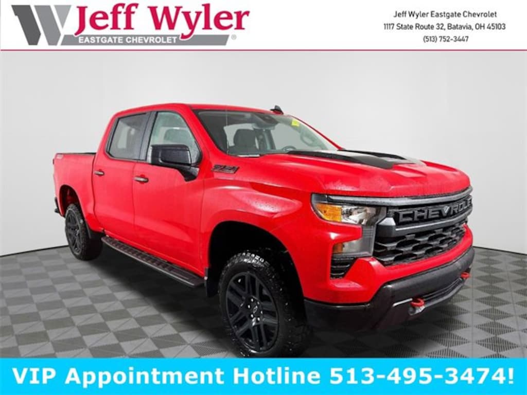 Red Hot 2026 Chevrolet Silverado 1500 Custom Trail Boss 2.7L I4 Turbocharged DOHC 16V LEV3-SULEV30 310hp 4WD 8-Speed Automatic 16/17 City/Highway MPG Jeff Wyler Eastgate Auto Mall is very proud to offer this handsome-looking 2026 Chevrolet Silverado 1500 Custom Trail Boss in Red Hot. Well equipped with: Custom Convenience Package (Electric Rear-Window Defogger, EZ Lift Power Lock & Release Tailgate, LED Cargo Area Lighting, Remote Vehicle Starter System, and Theft Deterrent System (Unauthorized Entry)), Dark Essentials Package (LPO) (Black Name Plates (LPO)), Off-Road Appearance Package (LPO) (Bed Mounted Tubular Sport Bar (LPO), Off-Road High Clearance Steps (LPO), and Off-Road Recovery Kit (LPO)), Preferred Equipment Group 2CX (10-Way Power Driver Seat w/Lumbar, 120-Volt Bed Mounted Power Outlet, 120-Volt Interior Power Outlet, 3.5 Monochromatic Display Driver Info Center, Auto-Locking Rear Differential, Bluetooth® For Phone, Color-Keyed Carpeting Floor Covering, Deep-Tinted Glass, Dual Rear USB Ports (Charge Only), Electronic Cruise Control, Front Rubberized Vinyl Floor Mats, HD Rear Vision Camera, Manual Tilt Wheel Steering Column, OnStar Services Capable, Performance Red Recovery Hooks, Power Front Windows w/Driver Express Up/Down, Power Front Windows w/Passenger Express Down, Power Rear Windows w/Express Down, Rear 60/40 Folding Bench Seat (Folds Up), Rear Rubberized-Vinyl Floor Mats, Remote Keyless Entry, SiriusXM Trial Subscription, Standard Tailgate, Teen Driver, Tire Pressure Monitoring System, and Wi-Fi Hot Spot Capable), Suspension Package (Heavy-Duty Air Filter and Hill Descent Control), Trailering Package (Hitch Guidance), 220 Amp Alternator, 3.42 Rear Axle Ratio, 4-Wheel Disc Brakes, 40/20/40 Front Split-Bench Seat, 6 Speakers, 6-Speaker Audio System, ABS brakes, Air Conditioning, All-Weather Floor Liner (LPO) (AAK), Alloy wheels, AM/FM radio: SiriusXM, Apple CarPlay/Android Auto, Auto High-beam Headlights, Automatic Emergency Braking, Black Tailgate CHEVROLET Lettering (LPO), Brake assist, Chevytec Spray-On Black Bedliner, Cloth Seat Trim, Compass, Delay-off headlights, Driver door bin, Driver vanity mirror, Dual front impact airbags, Dual front side impact airbags, Electronic Stability Control, Emergency communication system: OnStar, Following Distance Indicator, Forward Collision Alert, Front anti-roll bar, Front Center Armrest w/Storage, Front Pedestrian Braking, Front reading lights, Front wheel independent suspension, Fully automatic headlights, Heated door mirrors, Illuminated entry, Integrated Trailer Brake Controller, IntelliBeam Automatic High Beam On/Off, Lane Keep Assist w/Lane Departure Warning, Low tire pressure warning, Occupant sensing airbag, Outside temperature display, Overhead airbag, Overhead console, Panic alarm, Passenger door bin, Passenger vanity mirror, Power door mirrors, Power driver seat, Power steering, Power windows, Premium audio system: Chevrolet Infotainment 3, Radio data system, Radio: Chevrolet Infotainment 3 System, Rear reading lights, Rear step bumper, Rear window defroster, Remote keyless entry, Security system, Single Outlet Exhaust, Speed control, Speed-sensing steering, Split folding rear seat, Tachometer, Tilt steering wheel, Traction control, Trip computer, Variably intermittent wipers, Voltmeter, Wheels: 18 x 8.5 Black Painted Aluminum, and Wheels: 20 x 9 High Gloss Black Painted Alum. Price includes: $1000 - GM Bonus Cash. Exp. 01/02/2026 $3000 - Chevrolet Consumer Cash Program. Exp. 01/02/2026