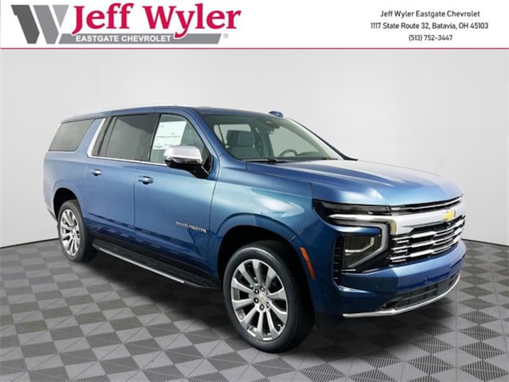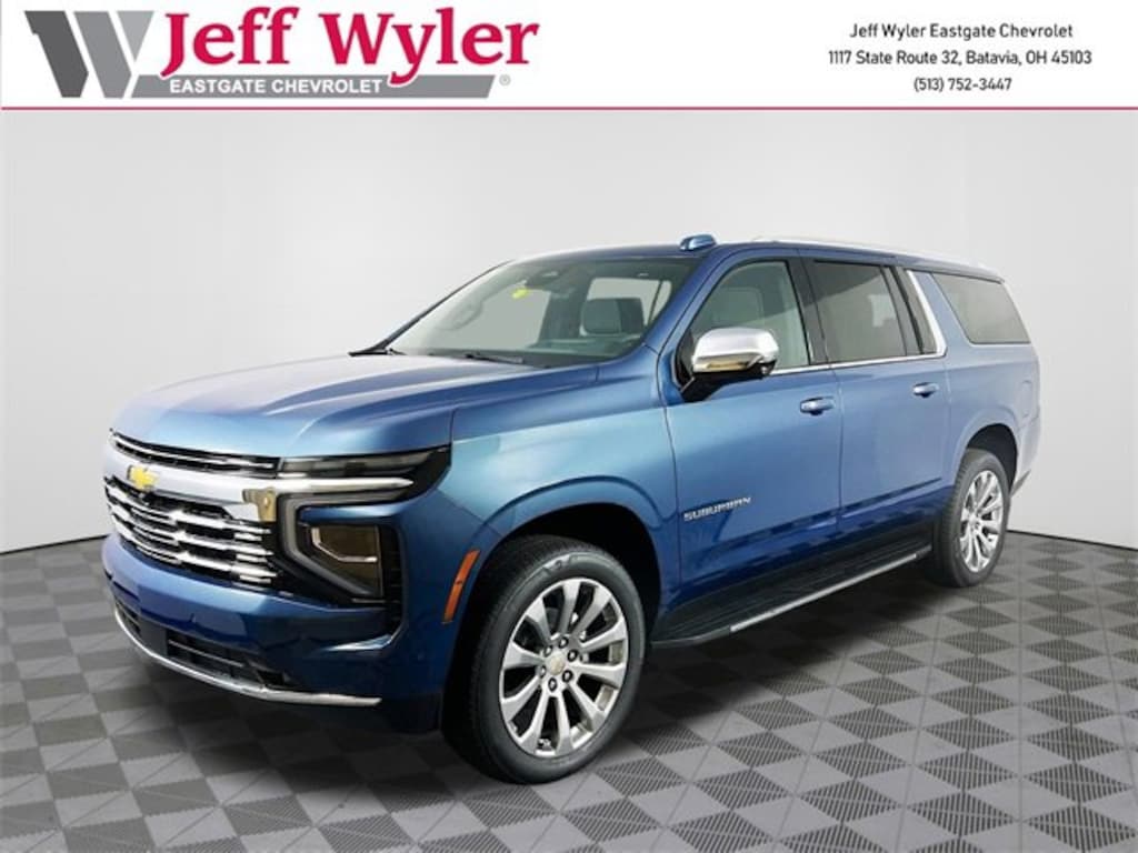 Lakeshore Blue Metallic 2026 Chevrolet Suburban Premier EcoTec3 5.3L V8 4WD 10-Speed Automatic with Overdrive 14/19 City/Highway MPG Jeff Wyler Eastgate Auto Mall is excited to offer this outstanding 2026 Chevrolet Suburban Premier in Lakeshore Blue Metallic. Well equipped with: Advanced Security Package (Glass Breakage Sensor, Self-Powered Horn Theft-Deterrent Alarm System, Vehicle Inclination Sensor, and Vehicle Interior Movement Sensor), Preferred Equipment Group 1LZ (3rd Row 60/40 Power-Folding Split-Bench, 4-Way Power Driver Lumbar Seat Adjuster, 4-Way Power Front Passenger Lumbar Seat Adjuster, 8-Way Power Front Passenger Seat Adjuster, Auto-Dimming Inside Rear-View Mirror, Bose 10-Speaker Surround w/CenterPoint, Bright Front & Rear Door Sill Plates, Chrome Door Handles w/Body-Color Strip, Chrome Mirror Caps, Dual Exhaust System, Front LED Fog Lamps, Heated 2nd Row Outboard Seats, Heated Driver & Front Passenger Seats, Heated Power-Adjustable Outside Mirrors, Heated Steering Wheel, Interior Camera, LED Headlamps w/LED Daytime Running Lamps, LED Tail Lamps, Memory Settings, Perforated Heated & Ventilated Seats, Power Release 2nd Row Bucket Seats, Power Tilt & Telescopic Steering Column, Power-Sliding Center Floor Console, Rear Power Liftgate, Universal Home Remote, and Wireless Phone Charging), Premium Liner Protection Package (LPO) (1st & 2nd Rows Premium Floor Liners (LPO), 3rd Row All-Weather Floor Liners (LPO), and All-Weather Cargo Mat (LPO)), Technology & Entertainment Package (Dual-Pane Power Panoramic Sunroof and Rear Seat Media System), Technology Package (15 Diagonal Multi-Color Head-Up Display, AutoSense Hands-Free Power Liftgate, and Inside Rearview Auto-Dimming Rear Camera Mirror), 10 Speakers, 20 x 9 Polished Aluminum Wheels, 3.23 Rear Axle Ratio, 3rd row seats: split-bench, 4-Wheel Disc Brakes, 8-Way Power Driver Seat Adjuster, ABS brakes, Adaptive suspension, Air Conditioning, Alloy wheels, AM/FM radio: SiriusXM with 360L, Apple CarPlay/Android Auto, Auto High-beam Headlights, Auto-dimming door mirrors, Auto-dimming Rear-View mirror, Auto-leveling suspension, Automatic temperature control, Brake assist, Bumpers: body-color, Compass, Delay-off headlights, Driver door bin, Driver vanity mirror, Dual front impact airbags, Dual front side impact airbags, Electronic Stability Control, Emergency communication system: OnStar Services capable, Exterior Parking Camera Rear, Four wheel independent suspension, Front anti-roll bar, Front Bucket Seats, Front Center Armrest, Front dual zone A/C, Front fog lights, Front reading lights, Fully automatic headlights, Garage door transmitter, Heated door mirrors, Heated front seats, Heated rear seats, Heated steering wheel, Illuminated entry, Low tire pressure warning, Magnetic Ride Control Suspension, Memory seat, Navigation system: Google built-in compatibility (select service plan required, terms and limitations apply), Occupant sensing airbag, Outside temperature display, Overhead airbag, Overhead console, Panic alarm, Passenger door bin, Passenger vanity mirror, Perforated Leather Seating Surfaces, Power door mirrors, Power driver seat, Power Liftgate, Power passenger seat, Power steering, Power windows, Radio data system, Radio: 17.7 Diagonal Advanced Color LCD Display, Rain sensing wipers, Rear air conditioning, Rear anti-roll bar, Rear reading lights, Rear window defroster, Rear window wiper, Remote keyless entry, Security system, SiriusXM w/360L Trial Subscription, Speed control, Speed-sensing steering, Split folding rear seat, Spoiler, Steering wheel memory, Steering wheel mounted audio controls, Tachometer, Telescoping steering wheel, Tilt steering wheel, Traction control, Trip computer, Turn signal indicator mirrors, Variably intermittent wipers, Ventilated front seats, Voltmeter, Wheel Locks (Set of 4) (LPO), Wheels: 22 x 9 Manoogian Silver Painted Alum, and Wireless Apple CarPlay/Wireless Android Auto.