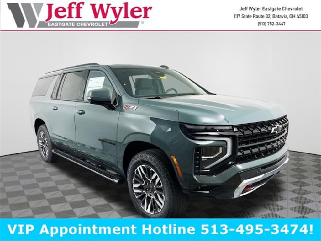 Cypress 2026 Chevrolet Suburban Z71 EcoTec3 5.3L V8 4WD 10-Speed Automatic with Overdrive 14/19 City/Highway MPG Jeff Wyler Eastgate Auto Mall is excited to offer this good-looking 2026 Chevrolet Suburban Z71 in Cypress. Well equipped with: Advanced Trailering Package (Blind Zone Steering Assist w/Trailering, Hitch View w/Pan/Zoom Image Adjustment, and Smart Trailer Integration Indicator), All-Weather Liner Protection Package (LPO) (1st & 2nd Rows All-Weather Floor Liners (LPO), 3rd Row All-Weather Floor Liners (LPO), and All-Weather Cargo Mat (LPO)), Comfort Package (2nd Row Pwr Release 60/40 Split-Folding Bench Seat, 3rd Row 60/40 Power-Folding Split-Bench, Bose 10-Speaker Surround w/CenterPoint, Heated 2nd Row Outboard Seats, Heated Power-Adjustable Outside Mirrors, Heated Steering Wheel, LED Headlamps w/LED Daytime Running Lamps, LED Tail Lamps, and Memory Settings), Max Trailering Package (Integrated Trailer Brake Controller), Off-Road Capability Package (Air Ride Adaptive Suspension, Electronic Limited Slip Differential, and Magnetic Ride Control Suspension), Z71 Off-Road Package (2 USB Charge/Data Ports in Center Console Delete, Power-Sliding Center Floor Console, and Rear Seat Media System), 2-Speed Active Electronic AutoTrac Transfer Case, 2-Way Driver Power Lumbar Seat Adjuster, 2-Way Front Passenger Power Lumbar Seat Adjuster, 3.23 Rear Axle Ratio, 3rd row seats: split-bench, 4-Wheel Disc Brakes, 6 Speakers, 6-Speaker Audio System, 8-Way Power Driver Seat Adjuster, 8-Way Power Front Passenger Seat Adjuster, ABS brakes, Air Conditioning, Alloy wheels, AM/FM radio: SiriusXM with 360L, Apple CarPlay/Android Auto, Auto High-beam Headlights, Auto-Dimming Inside Rear-View Mirror, Auto-dimming Rear-View mirror, Automatic temperature control, Black Tubular Assist Steps, Brake assist, Bright Front & Rear Door Sill Plates, Bumpers: body-color, Compass, Delay-off headlights, Driver door bin, Driver vanity mirror, Dual Exhaust System, Dual front impact airbags, Dual front side impact airbags, Dual-Pane Power Panoramic Sunroof, Electronic Stability Control, Emergency communication system: OnStar Services capable, Exterior Parking Camera Rear, Four wheel independent suspension, Front anti-roll bar, Front Bucket Seats, Front Center Armrest, Front dual zone A/C, Front fog lights, Front High-Approach Angle Fascia, Front LED Fog Lamps, Front reading lights, Fully automatic headlights, Garage door transmitter, Heated door mirrors, Heated Driver & Front Passenger Seats, Heated front seats, Heavy-Duty Air Filter, Hill Descent Control, Illuminated entry, Interior Camera, Leather-Appointed Seating, Low tire pressure warning, Memory seat, Memory Settings For Driver, Navigation system: Google built-in compatibility (select service plan required, terms and limitations apply), Occupant sensing airbag, Outside temperature display, Overhead airbag, Overhead console, Panic alarm, Passenger door bin, Passenger vanity mirror, Power door mirrors, Power driver seat, Power Liftgate, Power passenger seat, Power Release 2nd Row Bucket Seats, Power steering, Power windows, Premium Smooth Ride Suspension, Radio data system, Radio: 17.7 Diagonal Advanced Color LCD Display, Rain sensing wipers, Rear air conditioning, Rear anti-roll bar, Rear Power Liftgate, Rear reading lights, Rear seat center armrest, Rear window defroster, Rear window wiper, Red Recovery Hooks, Remote keyless entry, Security system, SiriusXM w/360L Trial Subscription, Speed control, Speed-sensing steering, Split folding rear seat, Spoiler, Steering wheel mounted audio controls, Tachometer, Telescoping steering wheel, Tilt steering wheel, Traction control, Trip computer, Universal Home Remote, Variably intermittent wipers, Voltmeter, Wheels: 20 x 9 Bright Machined Aluminum, Wireless Apple CarPlay/Wireless Android Auto, Wireless Phone Charging, and Z71 Exterior Features.