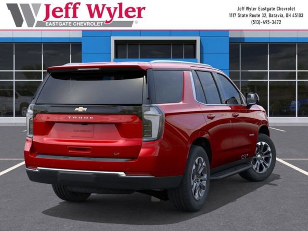 Radiant Red Tintcoat 2026 Chevrolet Tahoe LT EcoTec3 5.3L V8 4WD 10-Speed Automatic with Overdrive 15/19 City/Highway MPG Jeff Wyler Eastgate Auto Mall is pleased to offer this fantastic-looking 2026 Chevrolet Tahoe LT in Radiant Red Tintcoat. Well equipped with: Advanced Trailering Package (Blind Zone Steering Assist with Trailering, Hitch View with Pan/Zoom Image Adjustment, and Smart Trailer Integration Indicator), All-Weather Liner Protection Package (1st and 2nd Rows All-Weather Floor Liners, 3rd Row All-Weather Floor Liners, and All-Weather Cargo Mat), Comfort Package (2nd Row Power Release 60/40 Split-Folding Bench Seat, 3rd Row 60/40 Power-Folding Split-Bench Seat, Bose 10-Speaker Centerpoint Surround Audio System Feature, Heated 2nd Row Outboard Seats, Heated Steering Wheel, LED Headlamps with LED Daytime Running Lamps, LED Tail Lamps, Memory Settings, and Outside Heated Power-Adjustable Mirrors), Luxury Package (Auto-Dimming Inside Rear-View Mirror, Front LED Fog Lamps, and Universal Home Remote), Max Trailering Package (2-Speed Active Electronic AutoTrac Transfer Case, Hill Descent Control, and Integrated Trailer Brake Controller), Preferred Equipment Group 1LT (1st and 2nd Row Color-Keyed Carpeted Floor Mats, 3-Spoke Wrapped Steering Wheel, 3rd Row Manual 60/40 Split-Folding Bench Seats, Color-Keyed Carpeting Floor Covering, Floor Console with Storage Area, Front Bucket Seats, Frontal Driver and Outboard Passenger Airbags, Interior Camera, Key Card, Memory Settings For Driver, Rear Power Liftgate, Remote Start, SiriusXM with 360L Trial Subscription, USB Ports, and Wireless Phone Charging), 2-Way Power Driver Lumbar Seat Adjuster, 2-Way Power Front Passenger Lumbar Seat Adjuster, 3 Years SiriusXM, 3.23 Rear Axle Ratio, 3rd row seats: split-bench, 4-Wheel Disc Brakes, 6 Speakers, 6-Speaker Audio System Feature, 8-Way Power Driver Seat Adjuster, 8-Way Power Front Passenger Seat Adjuster, ABS brakes, Air Conditioning, Alloy wheels, AM/FM radio: SiriusXM with 360L, Apple CarPlay/Android Auto, Auto High-beam Headlights, Automatic temperature control, Brake assist, Bumpers: body-color, Compass, Delay-off headlights, Driver door bin, Driver vanity mirror, Dual front impact airbags, Dual front side impact airbags, Electronic Stability Control, Emergency communication system: OnStar and Chevrolet connected services capable, Exterior Parking Camera Rear, Extra Capacity Cooling System, Four wheel independent suspension, Front anti-roll bar, Front Center Armrest, Front dual zone A/C, Front reading lights, Fully automatic headlights, Heated door mirrors, Heated Driver and Front Passenger Seats, Heated front seats, Illuminated entry, Leather-Appointed Seat Trim, Low tire pressure warning, Memory seat, Navigation system: Google built-in compatibility (select service plan required, terms and limitations apply), Occupant sensing airbag, Outside temperature display, Overhead airbag, Overhead console, Panic alarm, Passenger door bin, Passenger vanity mirror, Power door mirrors, Power driver seat, Power Liftgate, Power passenger seat, Power steering, Power windows, Premium audio system: Chevrolet Infotainment 3 Premium, Premium Smooth Ride Suspension, Radio data system, Radio: 17.7 Diagonal Advanced Color LCD Display, Rain sensing wipers, Rear air conditioning, Rear anti-roll bar, Rear reading lights, Rear seat center armrest, Rear window defroster, Rear window wiper, Remote keyless entry, Security system, Speed control, Speed-sensing steering, Split folding rear seat, Spoiler, Steering wheel mounted audio controls, Tachometer, Telescoping steering wheel, Tilt steering wheel, Traction control, Trip computer, Variably intermittent wipers, Voltmeter, Wheels: 18 x 8.5 Bright Silver Painted Aluminum, and Wheels: 20 x 9 Machined Aluminum.