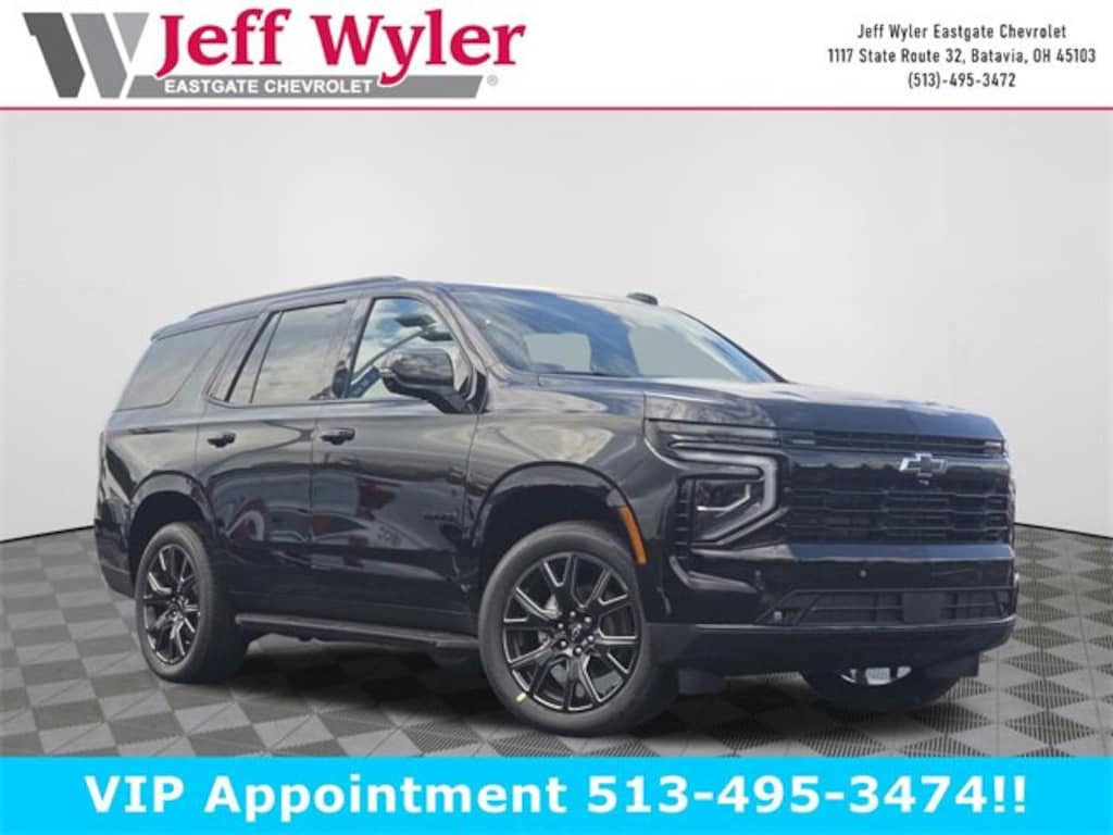 Black 2026 Chevrolet Tahoe RST EcoTec3 5.3L V8 4WD 10-Speed Automatic with Overdrive 15/19 City/Highway MPG Jeff Wyler Eastgate Auto Mall is honored to offer this gorgeous-looking 2026 Chevrolet Tahoe RST in Black. Well equipped with: Advanced Trailering Package (Blind Zone Steering Assist with Trailering, Hitch View with Pan/Zoom Image Adjustment, and Smart Trailer Integration Indicator), All-Weather Liner Protection Package (1st and 2nd Rows All-Weather Floor Liners, 3rd Row All-Weather Floor Liners, and All-Weather Cargo Mat), Comfort Package (2nd Row Power Release 60/40 Split-Folding Bench Seat, 3rd Row 60/40 Power-Folding Split-Bench Seat, Bose 10-Speaker Centerpoint Surround Audio System Feature, Heated 2nd Row Outboard Seats, Heated Steering Wheel, LED Headlamps with LED Daytime Running Lamps, LED Tail Lamps, Memory Settings, and Outside Heated Power-Adjustable Mirrors), Max Trailering Package (2-Speed Active Electronic AutoTrac Transfer Case, Hill Descent Control, and Integrated Trailer Brake Controller), Preferred Equipment Group 1SP (1st and 2nd Row Color-Keyed Carpeted Floor Mats, 3-Spoke Wrapped Steering Wheel, 3rd Row Manual 60/40 Split-Folding Bench Seats, Auto-Dimming Inside Rear-View Mirror, Bright Front and Rear Door Sill Plates, Color-Keyed Carpeting Floor Covering, Dual Exhaust System, Floor Console with Storage Area, Front Bucket Seats, Front LED Fog Lamps, Frontal Driver and Outboard Passenger Airbags, Interior Camera, Key Card, Memory Settings For Driver, Rear Power Liftgate, Remote Start, RST Exterior Features, Set of 4 Wheel Locks, SiriusXM with 360L Trial Subscription, Universal Home Remote, USB Ports, Wheels: 22 x 9 Bright Machined, and Wireless Phone Charging), 2-Way Power Driver Lumbar Seat Adjuster, 2-Way Power Front Passenger Lumbar Seat Adjuster, 3.23 Rear Axle Ratio, 3rd row seats: split-bench, 4-Wheel Disc Brakes, 6 Speakers, 6-Speaker Audio System Feature, 8-Way Power Driver Seat Adjuster, 8-Way Power Front Passenger Seat Adjuster, ABS brakes, Air Conditioning, Alloy wheels, AM/FM radio: SiriusXM with 360L, Apple CarPlay/Android Auto, Auto High-beam Headlights, Auto-dimming Rear-View mirror, Automatic temperature control, Brake assist, Bumpers: body-color, Compass, Delay-off headlights, Driver door bin, Driver vanity mirror, Dual front impact airbags, Dual front side impact airbags, Electronic Stability Control, Emergency communication system: OnStar and Chevrolet connected services capable, Exterior Parking Camera Rear, Extra Capacity Cooling System, Four wheel independent suspension, Front anti-roll bar, Front Center Armrest, Front dual zone A/C, Front fog lights, Front reading lights, Fully automatic headlights, Garage door transmitter, Heated door mirrors, Heated Driver and Front Passenger Seats, Heated front seats, Illuminated entry, Low tire pressure warning, Memory seat, Navigation system: Google built-in compatibility (select service plan required, terms and limitations apply), Occupant sensing airbag, Outside temperature display, Overhead airbag, Overhead console, Panic alarm, Passenger door bin, Passenger vanity mirror, Perforated Leather Seat Trim, Power door mirrors, Power driver seat, Power Liftgate, Power passenger seat, Power Release 2nd Row Bucket Seats, Power steering, Power windows, Premium audio system: Chevrolet Infotainment 3 Premium, Premium Smooth Ride Suspension, Radio data system, Radio: 17.7 Diagonal Advanced Color LCD Display, Rain sensing wipers, Rear air conditioning, Rear anti-roll bar, Rear reading lights, Rear seat center armrest, Rear window defroster, Rear window wiper, Remote keyless entry, Security system, Speed control, Speed-sensing steering, Split folding rear seat, Spoiler, Steering wheel mounted audio controls, Tachometer, Telescoping steering wheel, Tilt steering wheel, Traction control, Trip computer, Variably intermittent wipers, Voltmeter, and Wheels: 22 x 9 6-Spoke Carbon Flash Metallic Aluminum.