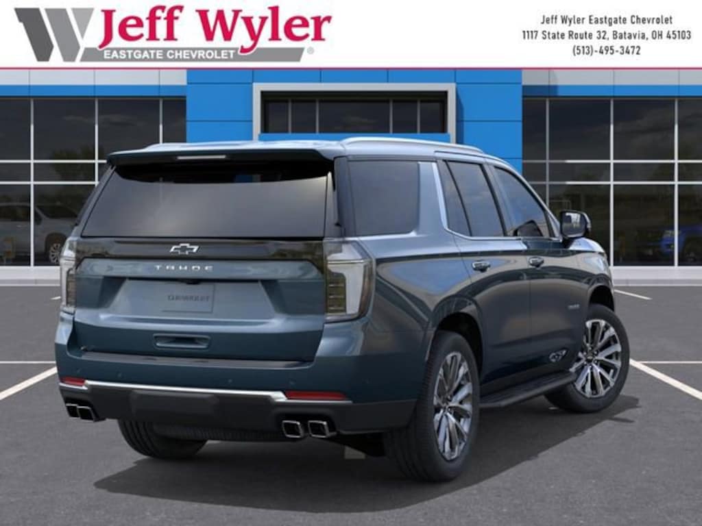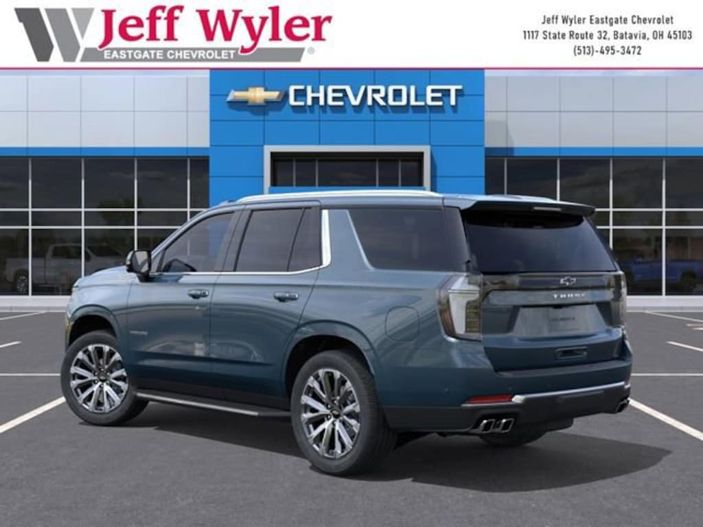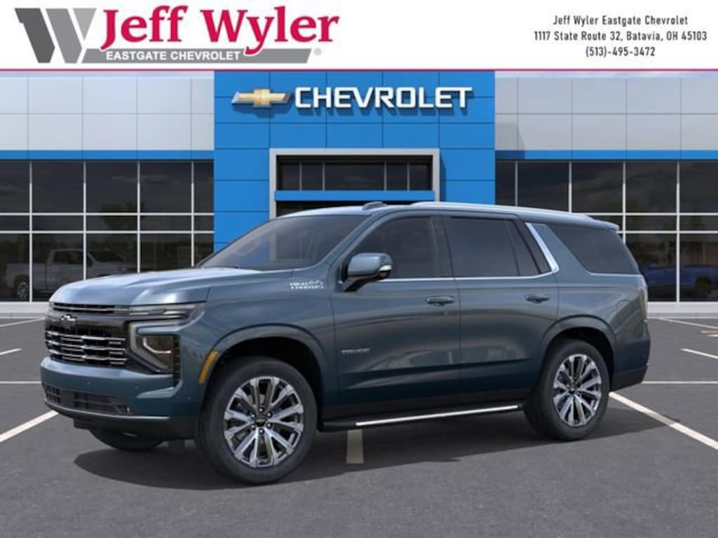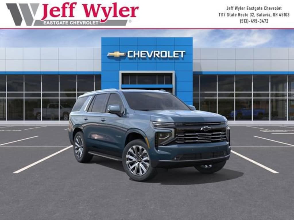 Lakeshore Blue 2026 Chevrolet Tahoe High Country EcoTec3 6.2L V8 4WD 10-Speed Automatic with Overdrive 14/18 City/Highway MPG Jeff Wyler Eastgate Auto Mall is excited to offer this handsome 2026 Chevrolet Tahoe High Country in Lakeshore Blue. Well equipped with: Premium Liner Protection Package (3rd Row All-Weather Floor Liners, All-Weather Cargo Mat, and First and Second Rows Premium Floor Liners), 10 Speakers, 15 Diagonal Multi-Color Head-Up Display, 1st and 2nd Row Color-Keyed Carpeted Floor Mats, 3-Spoke Wrapped Steering Wheel, 3.23 Rear Axle Ratio, 3rd Row 60/40 Power-Folding Split-Bench Seat, 3rd row seats: split-bench, 4-Way Power Driver Lumbar Seat Adjuster, 4-Way Power Front Passenger Lumbar Seat Adjuster, 4-Wheel Disc Brakes, 8-Way Power Driver Seat Adjuster, 8-Way Power Front Passenger Seat Adjuster, ABS brakes, Adaptive suspension, Air Conditioning, Alloy wheels, AM/FM radio: SiriusXM with 360L, Apple CarPlay/Android Auto, Auto High-beam Headlights, Auto-dimming door mirrors, Auto-dimming Rear-View mirror, Auto-leveling suspension, Automatic temperature control, Bose 10-Speaker Centerpoint Surround Audio System Feature, Brake assist, Bright Front and Rear Door Sill Plates, Bumpers: body-color, Chrome Door Handles with Body-Color Strip, Color-Keyed Carpeting Floor Covering, Compass, Delay-off headlights, Driver and Front Passenger Heated and Ventilated Seats, Driver door bin, Driver vanity mirror, Dual Exhaust System, Dual front impact airbags, Dual front side impact airbags, Electronic Stability Control, Emergency communication system: OnStar and Chevrolet connected services capable, Exterior Parking Camera Rear, Floor Console, Four wheel independent suspension, Front and Rear Black Bowtie Emblems, Front anti-roll bar, Front Bucket Seats, Front Center Armrest, Front dual zone A/C, Front fog lights, Front LED Fog Lamps, Front reading lights, Frontal Driver and Outboard Passenger Airbags, Fully automatic headlights, Garage door transmitter, Heads-Up Display, Heated 2nd Row Outboard Seats, Heated door mirrors, Heated Driver and Front Passenger Seats, Heated front seats, Heated rear seats, Heated Steering Wheel, Heated steering wheel, Illuminated entry, Inside Rearview Auo-Dimming Rear Camera Mirror, Interior Camera, Key Card, LED Headlamps with LED Daytime Running Lamps, LED Tail Lamps, Low tire pressure warning, Magnetic Ride Control Suspension, Memory seat, Memory Settings, Navigation system: Google built-in compatibility (select service plan required, terms and limitations apply), Occupant sensing airbag, Outside Heated Power-Adjustable Mirrors, Outside temperature display, Overhead airbag, Overhead console, Panic alarm, Passenger door bin, Passenger vanity mirror, Perforated Leather Seat Trim, Power door mirrors, Power driver seat, Power Liftgate, Power passenger seat, Power Release 2nd Row Bucket Seats, Power steering, Power Tilt and Telescopic Steering Column, Power windows, Premium audio system: Chevrolet Infotainment 3 Premium, Radio data system, Radio: 17.7 Diagonal Advanced Color LCD Display, Rain sensing wipers, Rear air conditioning, Rear anti-roll bar, Rear Power Liftgate, Rear reading lights, Rear window defroster, Rear window wiper, Remote keyless entry, Remote Start, Security system, Set of 4 Wheel Locks, SiriusXM with 360L Trial Subscription, Speed control, Speed-sensing steering, Split folding rear seat, Spoiler, Steering wheel memory, Steering wheel mounted audio controls, Tachometer, Telescoping steering wheel, Tilt steering wheel, Traction control, Trip computer, Turn signal indicator mirrors, Universal Home Remote, Variably intermittent wipers, Ventilated front seats, Voltmeter, Wheels: 22 x 9 Bright Machined Aluminum, and Wireless Phone Charging. Awards: