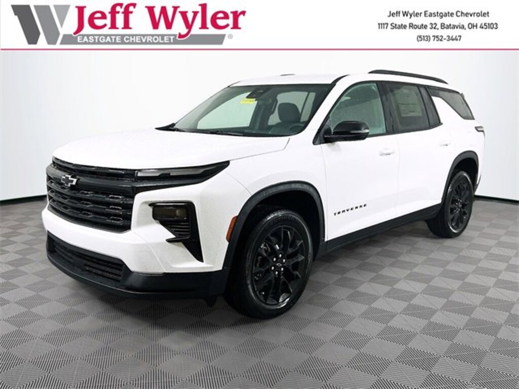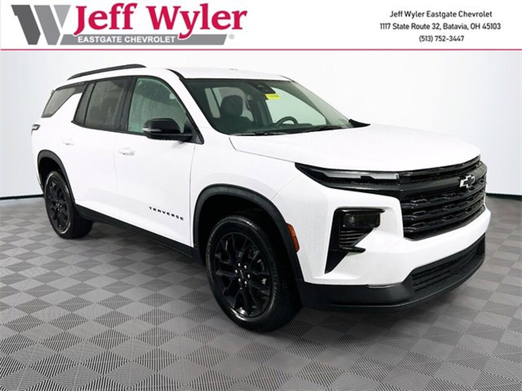 Summit White 2026 Chevrolet Traverse LT 1LT 2.5L DOHC FWD 8-Speed Automatic 20/26 City/Highway MPG Jeff Wyler Eastgate Auto Mall is honored to offer this fantastic-looking 2026 Chevrolet Traverse LT in Summit White. Well equipped with: Floor Liner Package (LPO) (1st & 2nd Row All-Weather Floor Liners (LPO), 3rd Row All-Weather Floor Liner (LPO), and Integrated Cargo Liner (LPO)), Midnight/Sport Edition (High Gloss Black Door Upper Molding and Wheels: 20 High Gloss Black Painted Aluminum), 3rd row seats: split-bench, 4-Way Manual Front Passenger Seat Adjuster, 4-Wheel Disc Brakes, 6 Speakers, 6-Speaker Audio System Feature, 8-Way Power Driver Seat Adjuster, ABS brakes, Air Conditioning, Alloy wheels, AM/FM radio: SiriusXM with 360L, Apple CarPlay/Android Auto, Auto High-beam Headlights, Automatic temperature control, Brake assist, Bumpers: body-color, Child-Seat-Sensing Airbag, Compass, Delay-off headlights, Driver door bin, Driver vanity mirror, Dual front impact airbags, Dual front side impact airbags, Electronic Stability Control, Emergency communication system: OnStar, Four wheel independent suspension, Front anti-roll bar, Front Bucket Seats, Front Center Armrest, Front dual zone A/C, Front reading lights, Fully automatic headlights, Heated door mirrors, Heated Driver & Front Passenger Seats, Heated front seats, Heated steering wheel, Illuminated entry, Low tire pressure warning, Navigation System, Occupant sensing airbag, Outside temperature display, Overhead airbag, Overhead console, Panic alarm, Passenger door bin, Passenger vanity mirror, Power door mirrors, Power driver seat, Power Liftgate, Power steering, Power windows, Premium Cloth Seat Trim, Radio data system, Radio: Audio System w/17.7 Diagonal Display, Rear air conditioning, Rear anti-roll bar, Rear reading lights, Rear window defroster, Rear window wiper, Remote keyless entry, Security system, SiriusXM w/360L Trial Subscription, Speed control, Speed-sensing steering, Spoiler, Steering wheel mounted audio controls, Tachometer, Telescoping steering wheel, Tilt steering wheel, Traction control, Trip computer, Turn signal indicator mirrors, Variably intermittent wipers, Voltmeter, and Wheels: 18 Grazen Metallic Machined-Face Aluminum. 20/26 City/Highway MPG