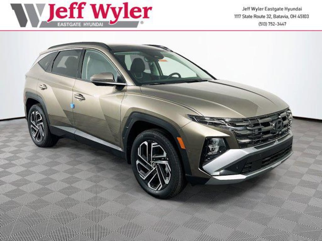 Cashmere Bronze 2025 Hyundai Tucson Hybrid Limited 1.6L I4 DGI Hybrid Turbocharged DOHC 16V LEV3-SULEV30 AWD 6-Speed Automatic 37/36 City/Highway MPG Jeff Wyler Eastgate Auto Mall is honored to offer this gorgeous-looking 2025 Hyundai Tucson Hybrid Limited in Cashmere Bronze. Well equipped with: Option Group 01, 19" Alloy Wheels, 4-Wheel Disc Brakes, 8 Speakers, ABS brakes, Air Conditioning, All Season Fitted Liners, Alloy wheels, AM/FM radio: SiriusXM, Apple CarPlay & Android Auto, Auto High-beam Headlights, Auto-dimming Rear-View mirror, Automatic temperature control, Brake assist, Bumpers: body-color, Cargo Cover, Cargo Net, Cargo Tray, Carpeted Floor Mats, Delay-off headlights, Driver door bin, Driver vanity mirror, Dual front impact airbags, Dual front side impact airbags, Electronic Stability Control, Emergency communication system: Bluelink+, First Aid Kit, Four wheel independent suspension, Front anti-roll bar, Front Bucket Seats, Front Center Armrest, Front dual zone A/C, Front reading lights, Fully automatic headlights, Garage door transmitter: HomeLink, Heads-Up Display, Heated & Ventilated Front Bucket Seats, Heated door mirrors, Heated front seats, Heated rear seats, Heated steering wheel, Illuminated entry, Leather steering wheel, Leather-Trimmed Seat Trim, Low tire pressure warning, Memory seat, Mud Guards, Navigation System, Occupant sensing airbag, Outside temperature display, Overhead airbag, Overhead console, Panic alarm, Passenger door bin, Passenger vanity mirror, Power door mirrors, Power driver seat, Power Liftgate, Power moonroof, Power passenger seat, Power steering, Power windows, Radio data system, Radio: Bose Premium w/AM/FM/HD Audio System, Rain sensing wipers, Rear anti-roll bar, Rear reading lights, Rear seat center armrest, Rear side impact airbag, Rear window defroster, Rear window wiper, Remote keyless entry, Security system, Speed control, Split folding rear seat, Spoiler, Steering wheel mounted audio controls, Tachometer, Telescoping steering wheel, Tilt steering wheel, Traction control, Trip computer, Turn signal indicator mirrors, Variably intermittent wipers, and Ventilated front seats. 37/36 City/Highway MPG