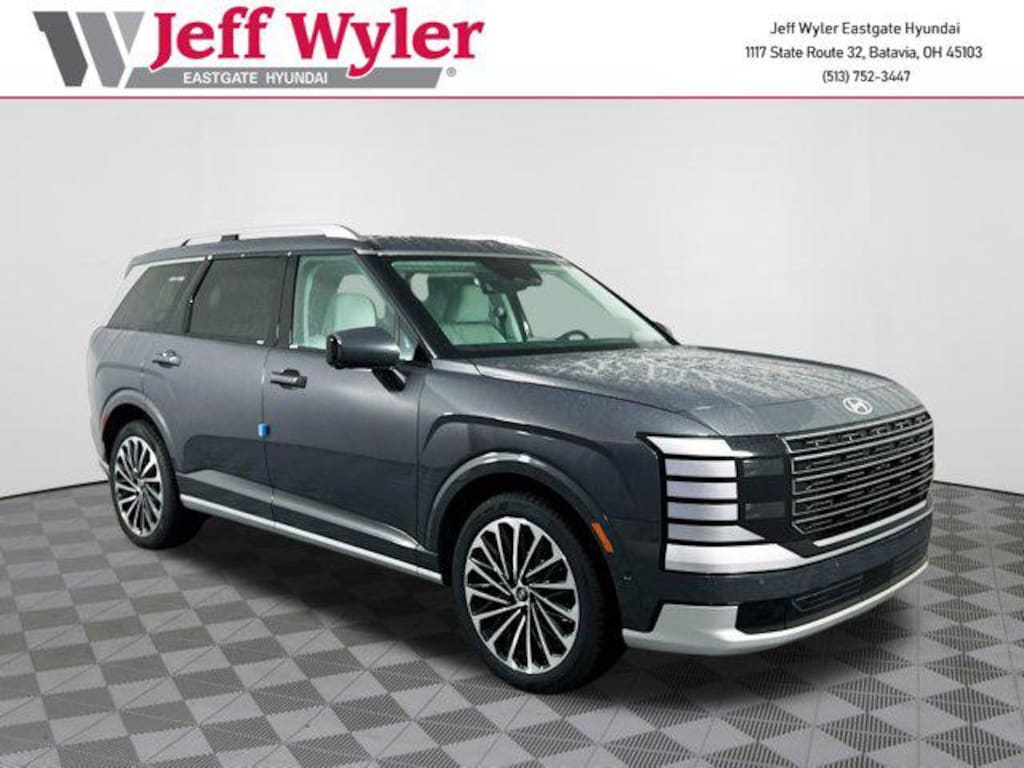 Ecotronic Gray Pearl 2026 Hyundai Palisade Calligraphy V6 AWD 8-Speed Automatic 18/24 City/Highway MPG Jeff Wyler Eastgate Auto Mall is pleased to offer this wonderful-looking 2026 Hyundai Palisade Calligraphy in Ecotronic Gray Pearl. Well equipped with: Option Group 01, 14 Speakers, 3rd row seats: split-bench, 4-Wheel Disc Brakes, ABS brakes, Air Conditioning, Alloy wheels, AM/FM radio: SiriusXM, Apple CarPlay & Android Auto, Audio memory, Auto High-beam Headlights, Auto-dimming door mirrors, Auto-dimming Rear-View mirror, Auto-leveling suspension, Automatic temperature control, Brake assist, Bumpers: body-color, Cargo Cover, Cargo Tray, Carpeted Floor Mats, Compass, Delay-off headlights, Driver door bin, Driver vanity mirror, Dual front impact airbags, Dual front side impact airbags, Electronic Stability Control, Emergency communication system: Bluelink+, Exterior Parking Camera Rear, First Aid Kit, Four wheel independent suspension, Front anti-roll bar, Front Bucket Seats, Front Center Armrest, Front dual zone A/C, Front reading lights, Fully automatic headlights, Garage door transmitter: HomeLink, Genuine wood console insert, Genuine wood dashboard insert, Heads-Up Display, Heated & Ventilated Front Bucket Seats, Heated door mirrors, Heated front seats, Heated rear seats, Heated steering wheel, HVAC memory, Illuminated entry, Knee airbag, Leather steering wheel, Low tire pressure warning, Memory seat, Navigation System, Occupant sensing airbag, Outside temperature display, Overhead airbag, Overhead console, Panic alarm, Passenger door bin, Passenger vanity mirror, Power door mirrors, Power driver seat, Power Liftgate, Power moonroof, Power passenger seat, Power steering, Power windows, Premium Nappa Leather Seat Trim, Radio data system, Radio: Infotainment Navigation System, Rain sensing wipers, Rear air conditioning, Rear anti-roll bar, Rear audio controls, Rear reading lights, Rear side impact airbag, Rear window defroster, Rear window wiper, Reclining 3rd row seat, Remote keyless entry, Security system, Speed control, Split folding rear seat, Spoiler, Steering wheel mounted audio controls, Tachometer, Telescoping steering wheel, Tilt steering wheel, Traction control, Trip computer, Turn signal indicator mirrors, Variably intermittent wipers, Ventilated front seats, Ventilated rear seats, and Wheels: 21" x 8.5J Alloy.