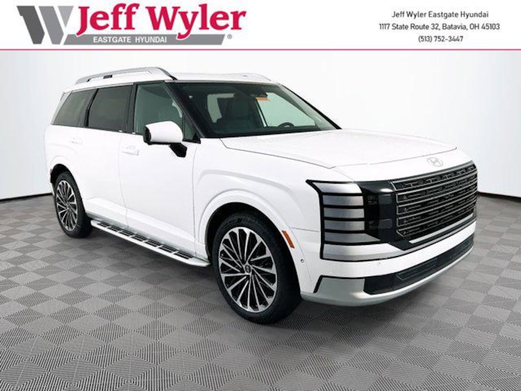 Creamy White Pearl 2026 Hyundai Palisade Hybrid Calligraphy 2.5L Turbocharged GDI 4-Cylinder Hybrid AWD 6-Speed Automatic Jeff Wyler Eastgate Auto Mall is excited to offer this wonderful-looking 2026 Hyundai Palisade Hybrid Calligraphy in Creamy White Pearl. Well equipped with: Option Group 01, 100W Charging Cable, 14 Speakers, 3rd row seats: split-bench, 4-Wheel Disc Brakes, ABS brakes, Air Conditioning, Alloy wheels, AM/FM radio: SiriusXM, Apple CarPlay & Android Auto, Audio memory, Auto High-beam Headlights, Auto-dimming door mirrors, Auto-dimming Rear-View mirror, Auto-leveling suspension, Automatic temperature control, Brake assist, Bumpers: body-color, Carpeted Floor Mats, Compass, Delay-off headlights, Driver door bin, Driver vanity mirror, Dual front impact airbags, Dual front side impact airbags, Electronic Stability Control, Emergency communication system: None, Exterior Parking Camera Rear, Four wheel independent suspension, Front anti-roll bar, Front Bucket Seats, Front Center Armrest, Front dual zone A/C, Front reading lights, Fully automatic headlights, Garage door transmitter: HomeLink, Genuine wood console insert, Genuine wood dashboard insert, Heads-Up Display, Heated and Ventilated Front Bucket Seats, Heated door mirrors, Heated front seats, Heated rear seats, Heated steering wheel, HVAC memory, Illuminated entry, Knee airbag, Leather steering wheel, Low tire pressure warning, Memory seat, Navigation System, Occupant sensing airbag, Outside temperature display, Overhead airbag, Overhead console, Panic alarm, Passenger door bin, Passenger vanity mirror, Power door mirrors, Power driver seat, Power Liftgate, Power moonroof, Power passenger seat, Power steering, Power windows, Premium Nappa Leather Seat Trim, Radio data system, Radio: Infotainment Navigation System, Rain sensing wipers, Rear air conditioning, Rear anti-roll bar, Rear audio controls, Rear reading lights, Rear side impact airbag, Rear window defroster, Rear window wiper, Reclining 3rd row seat, Remote keyless entry, Security system, Side Steps, Speed control, Split folding rear seat, Spoiler, Steering wheel mounted audio controls, Tachometer, Telescoping steering wheel, Tilt steering wheel, Traction control, Trip computer, Turn signal indicator mirrors, Variably intermittent wipers, Ventilated front seats, Ventilated rear seats, and Wheels: 21" x 8.5J Alloy.