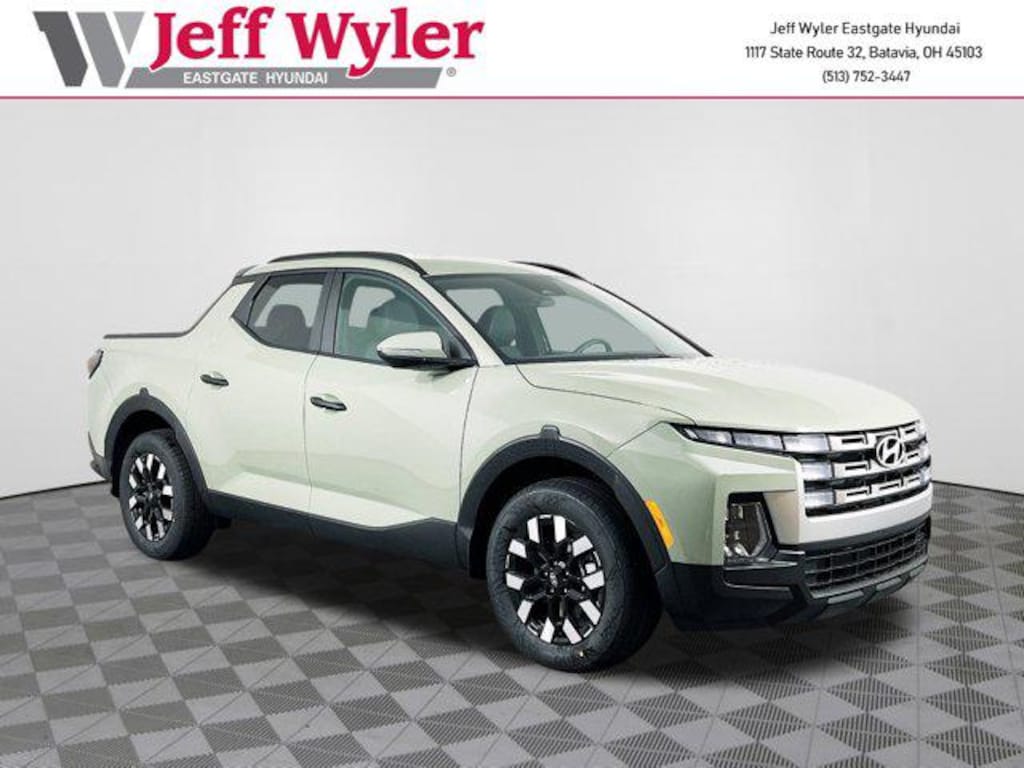 Sage Gray 2026 Hyundai Santa Cruz SEL 2.5L I4 AWD 8-Speed Automatic with SHIFTRONIC 21/29 City/Highway MPG Jeff Wyler Eastgate Auto Mall is proud to offer this great 2026 Hyundai Santa Cruz SEL in Sage Gray. Well equipped with: Option Group 01, 18" x 7.5J Alloy Wheels, 4-Wheel Disc Brakes, 4.081 Axle Ratio, 6 Speakers, ABS brakes, Air Conditioning, Alloy wheels, AM/FM radio: SiriusXM, Apple CarPlay & Android Auto, Auto High-beam Headlights, Auto-leveling suspension, Automatic temperature control, Brake assist, Bumpers: body-color, Carpeted Floor Mats, Compass, Delay-off headlights, Driver door bin, Driver vanity mirror, Dual front impact airbags, Dual front side impact airbags, Electronic Stability Control, Emergency communication system: Bluelink+, Exterior Parking Camera Rear, First Aid Kit, Four wheel independent suspension, Front anti-roll bar, Front Bucket Seats, Front Center Armrest, Front dual zone A/C, Front reading lights, Fully automatic headlights, H-Tex Leatherette Seat Trim, Heated door mirrors, Heated Front Bucket Seats, Heated front seats, Illuminated entry, Low tire pressure warning, Mud Guards, Occupant sensing airbag, Outside temperature display, Overhead airbag, Overhead console, Panic alarm, Passenger door bin, Passenger vanity mirror, Power door mirrors, Power driver seat, Power steering, Power windows, Radio data system, Radio: AM/FM/HD Audio System, Rear anti-roll bar, Rear reading lights, Rear side impact airbag, Rear step bumper, Rear window defroster, Remote keyless entry, Security system, Severe Weather Kit, Speed control, Speed-sensing steering, Split folding rear seat, Spoiler, Steering wheel mounted audio controls, Tachometer, Telescoping steering wheel, Tilt steering wheel, Tow Hitch, Traction control, Trip computer, Turn signal indicator mirrors, and Variably intermittent wipers. 21/29 City/Highway MPG