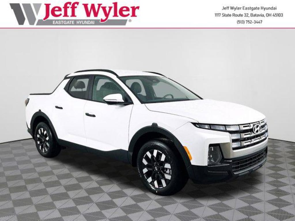 Atlas White 2026 Hyundai Santa Cruz SEL 2.5L I4 AWD 8-Speed Automatic with SHIFTRONIC 21/29 City/Highway MPG Jeff Wyler Eastgate Auto Mall is very proud to offer this beautiful 2026 Hyundai Santa Cruz SEL in Atlas White. Well equipped with: Option Group 01, 18" x 7.5J Alloy Wheels, 4-Wheel Disc Brakes, 4.081 Axle Ratio, 6 Speakers, ABS brakes, Air Conditioning, All Season Fitted Liners, Alloy wheels, AM/FM radio: SiriusXM, Apple CarPlay & Android Auto, Auto High-beam Headlights, Auto-leveling suspension, Automatic temperature control, Bed Mat, Brake assist, Bumpers: body-color, Compass, Delay-off headlights, Driver door bin, Driver vanity mirror, Dual front impact airbags, Dual front side impact airbags, Electronic Stability Control, Emergency communication system: Bluelink+, Exterior Parking Camera Rear, First Aid Kit, Four wheel independent suspension, Front anti-roll bar, Front Bucket Seats, Front Center Armrest, Front dual zone A/C, Front reading lights, Fully automatic headlights, H-Tex Leatherette Seat Trim, Heated door mirrors, Heated Front Bucket Seats, Heated front seats, Illuminated entry, Low tire pressure warning, Mud Guards, Occupant sensing airbag, Outside temperature display, Overhead airbag, Overhead console, Panic alarm, Passenger door bin, Passenger vanity mirror, Power door mirrors, Power driver seat, Power steering, Power windows, Radio data system, Radio: AM/FM/HD Audio System, Rear anti-roll bar, Rear reading lights, Rear side impact airbag, Rear step bumper, Rear window defroster, Remote keyless entry, Security system, Speed control, Speed-sensing steering, Split folding rear seat, Spoiler, Steering wheel mounted audio controls, Tachometer, Telescoping steering wheel, Tilt steering wheel, Tow Hitch, Traction control, Trip computer, Turn signal indicator mirrors, and Variably intermittent wipers. 21/29 City/Highway MPG