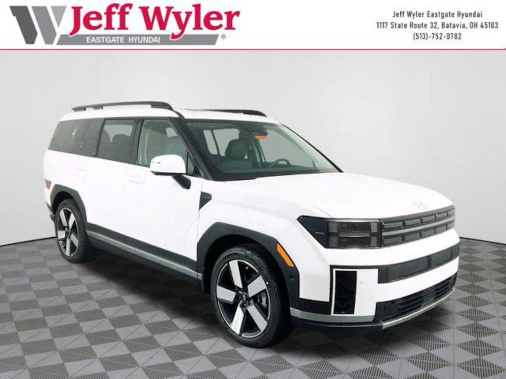 Serenity White 2026 Hyundai Santa Fe Hybrid Limited I4 AWD 6-Speed Automatic with Shiftronic Jeff Wyler Eastgate Auto Mall is honored to offer this great-looking 2026 Hyundai Santa Fe Hybrid Limited in Serenity White. Well equipped with: 7-Passenger Bench Seating (Option Group 02), 12 Speakers, 3rd row seats: bench, 4-Wheel Disc Brakes, ABS brakes, Air Conditioning, Alloy wheels, AM/FM radio: SiriusXM, Apple CarPlay & Android Auto, Auto High-beam Headlights, Auto-dimming Rear-View mirror, Automatic temperature control, Brake assist, Bumpers: body-color, Cargo Cover/Screen, Cargo Net, Cargo Organizer, Cargo Tray, Carpeted Floor Mats, Delay-off headlights, Driver door bin, Driver vanity mirror, Dual front impact airbags, Dual front side impact airbags, Electronic Stability Control, Emergency communication system, Exterior Parking Camera Rear, First Aid Kit, Four wheel independent suspension, Front anti-roll bar, Front Bucket Seats, Front Center Armrest, Front dual zone A/C, Front reading lights, Fully automatic headlights, Garage door transmitter: HomeLink, Heated & Ventilated Front Bucket Seats, Heated door mirrors, Heated front seats, Heated rear seats, Heated steering wheel, Illuminated entry, Knee airbag, Leather Seat Trim, Leather steering wheel, Low tire pressure warning, Memory seat, Mudguards, Navigation System, Occupant sensing airbag, Outside temperature display, Overhead airbag, Overhead console, Panic alarm, Passenger door bin, Passenger vanity mirror, Power door mirrors, Power driver seat, Power Liftgate, Power moonroof, Power passenger seat, Power steering, Power windows, Radio: AM/FM/HD Bose Premium Audio System, Rain sensing wipers, Rear anti-roll bar, Rear side impact airbag, Rear window defroster, Rear window wiper, Remote keyless entry, Roadside Assistance Kit, Security system, Speed control, Speed-sensing steering, Split folding rear seat, Spoiler, Steering wheel mounted audio controls, Tachometer, Telescoping steering wheel, Tilt steering wheel, Traction control, Transverse Panel, Trip computer, Turn signal indicator mirrors, Variably intermittent wipers, Ventilated front seats, and Wheels: 20" x 8.5J Alloy.