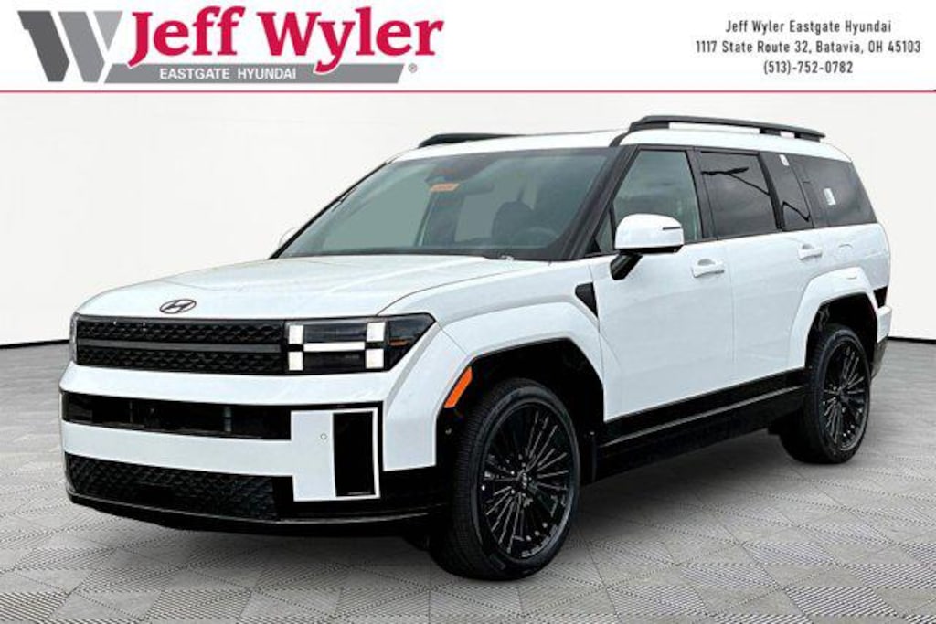 Priced below KBB Fair Purchase Price! Serenity White 2026 Hyundai Santa Fe Hybrid Calligraphy I4 AWD 6-Speed Automatic with Shiftronic 35/34 City/Highway MPG Jeff Wyler Eastgate Auto Mall is proud to offer this superb-looking 2026 Hyundai Santa Fe Hybrid Calligraphy in Serenity White. Well equipped with: Option Group 01, 12 Speakers, 3rd row seats: bench, 4-Wheel Disc Brakes, ABS brakes, Air Conditioning, Alloy wheels, AM/FM radio: SiriusXM, Apple CarPlay & Android Auto, Auto High-beam Headlights, Auto-dimming Rear-View mirror, Automatic temperature control, Brake assist, Bumpers: body-color, Cargo Cover/Screen, Cargo Net, Cargo Tray, Carpeted Floor Mats, Delay-off headlights, Driver door bin, Driver vanity mirror, Dual front impact airbags, Dual front side impact airbags, Electronic Stability Control, Emergency communication system, Exterior Parking Camera Rear, First Aid Kit, Four wheel independent suspension, Front anti-roll bar, Front Bucket Seats, Front Center Armrest, Front dual zone A/C, Front reading lights, Fully automatic headlights, Garage door transmitter: HomeLink, Heads-Up Display, Heated and Ventilated Front Bucket Seats, Heated door mirrors, Heated front seats, Heated rear seats, Heated steering wheel, Illuminated entry, Knee airbag, Leather steering wheel, Low tire pressure warning, Memory seat, Mudguards, Navigation System, Occupant sensing airbag, Outside temperature display, Overhead airbag, Overhead console, Panic alarm, Passenger door bin, Passenger vanity mirror, Power door mirrors, Power driver seat, Power Liftgate, Power moonroof, Power passenger seat, Power steering, Power windows, Quilted Premium Nappa Leather Seat Trim, Radio: AM/FM/HD Bose Premium Audio System, Rain sensing wipers, Rear anti-roll bar, Rear side impact airbag, Rear window defroster, Rear window wiper, Remote keyless entry, Security system, Speed control, Speed-sensing steering, Split folding rear seat, Spoiler, Steering wheel mounted audio controls, Tachometer, Telescoping steering wheel, Tilt steering wheel, Traction control, Trip computer, Turn signal indicator mirrors, Variably intermittent wipers, Ventilated front seats, and Wheels: 20" x 8.5J Unique Dark Finish Alloy. 35/34 City/Highway MPG Price includes: $2000 - Retail Bonus Cash. Exp. 04/30/2026