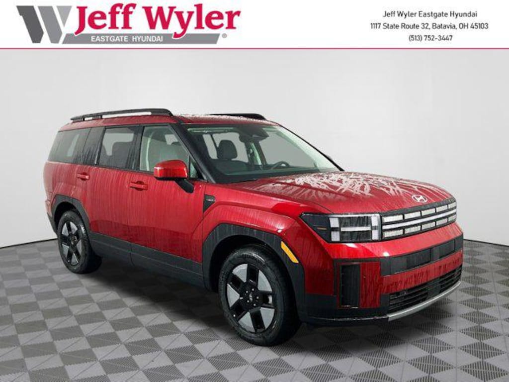 Ultimate Red 2026 Hyundai Santa Fe Hybrid SEL I4 AWD 6-Speed Automatic with Shiftronic Jeff Wyler Eastgate Auto Mall is honored to offer this terrific 2026 Hyundai Santa Fe Hybrid SEL in Ultimate Red. Well equipped with: Option Group 01, 18" x 7.5J Alloy Wheels, 3rd row seats: bench, 4-Wheel Disc Brakes, 6 Speakers, ABS brakes, Air Conditioning, Alloy wheels, AM/FM radio: SiriusXM, Apple CarPlay & Android Auto, Auto High-beam Headlights, Automatic temperature control, Brake assist, Bumpers: body-color, Cargo Cover/Screen, Cargo Net, Carpeted Floor Mats, Delay-off headlights, Driver door bin, Driver vanity mirror, Dual front impact airbags, Dual front side impact airbags, Electronic Stability Control, Emergency communication system, Exterior Parking Camera Rear, First Aid Kit, Four wheel independent suspension, Front anti-roll bar, Front Bucket Seats, Front Center Armrest, Front dual zone A/C, Front reading lights, Fully automatic headlights, H-Tex Leatherette Seat Trim, Heated door mirrors, Heated Front Bucket Seats, Heated front seats, Illuminated entry, Knee airbag, Leather steering wheel, Low tire pressure warning, Occupant sensing airbag, Outside temperature display, Overhead airbag, Overhead console, Panic alarm, Passenger door bin, Passenger vanity mirror, Power door mirrors, Power driver seat, Power Liftgate, Power steering, Power windows, Radio: AM/FM/HD Display Audio, Rear anti-roll bar, Rear seat center armrest, Rear side impact airbag, Rear window defroster, Rear window wiper, Remote keyless entry, Security system, Speed control, Speed-sensing steering, Split folding rear seat, Spoiler, Steering wheel mounted audio controls, Tachometer, Telescoping steering wheel, Tilt steering wheel, Traction control, Trip computer, Turn signal indicator mirrors, and Variably intermittent wipers.