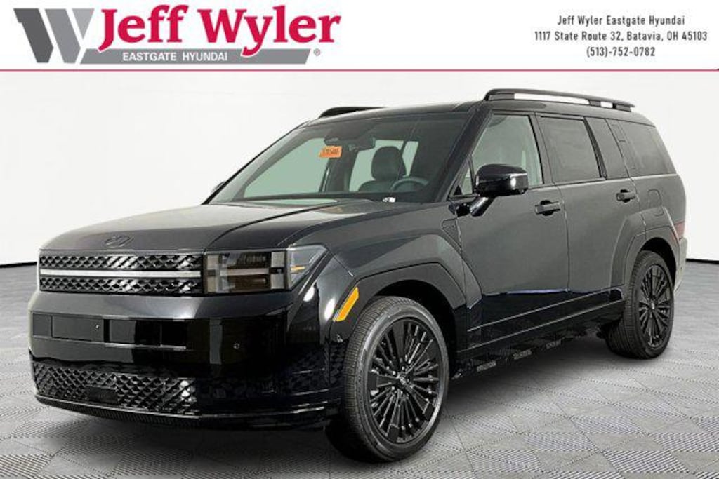 Priced below KBB Fair Purchase Price! Phantom Black 2026 Hyundai Santa Fe Hybrid Calligraphy I4 AWD 6-Speed Automatic with Shiftronic 35/34 City/Highway MPG Jeff Wyler Eastgate Auto Mall is pumped up to offer this great-looking 2026 Hyundai Santa Fe Hybrid Calligraphy in Phantom Black. Well equipped with: Option Group 01, 12 Speakers, 3rd row seats: bench, 4-Wheel Disc Brakes, ABS brakes, Air Conditioning, Alloy wheels, AM/FM radio: SiriusXM, Apple CarPlay & Android Auto, Auto High-beam Headlights, Auto-dimming Rear-View mirror, Automatic temperature control, Brake assist, Bumpers: body-color, Cargo Cover/Screen, Cargo Net, Carpeted Floor Mats, Delay-off headlights, Driver door bin, Driver vanity mirror, Dual front impact airbags, Dual front side impact airbags, Electronic Stability Control, Emergency communication system, Exterior Parking Camera Rear, First Aid Kit, Four wheel independent suspension, Front anti-roll bar, Front Bucket Seats, Front Center Armrest, Front dual zone A/C, Front reading lights, Fully automatic headlights, Garage door transmitter: HomeLink, Heads-Up Display, Heated and Ventilated Front Bucket Seats, Heated door mirrors, Heated front seats, Heated rear seats, Heated steering wheel, Illuminated entry, Knee airbag, Leather steering wheel, Low tire pressure warning, Memory seat, Navigation System, Occupant sensing airbag, Outside temperature display, Overhead airbag, Overhead console, Panic alarm, Passenger door bin, Passenger vanity mirror, Power door mirrors, Power driver seat, Power Liftgate, Power moonroof, Power passenger seat, Power steering, Power windows, Quilted Premium Nappa Leather Seat Trim, Radio: AM/FM/HD Bose Premium Audio System, Rain sensing wipers, Rear anti-roll bar, Rear side impact airbag, Rear window defroster, Rear window wiper, Remote keyless entry, Roof Rack Crossbars, Security system, Speed control, Speed-sensing steering, Split folding rear seat, Spoiler, Steering wheel mounted audio controls, Tachometer, Telescoping steering wheel, Tilt steering wheel, Traction control, Trip computer, Turn signal indicator mirrors, Variably intermittent wipers, Ventilated front seats, and Wheels: 20" x 8.5J Unique Dark Finish Alloy. 35/34 City/Highway MPG Price includes: $2000 - Retail Bonus Cash. Exp. 04/30/2026