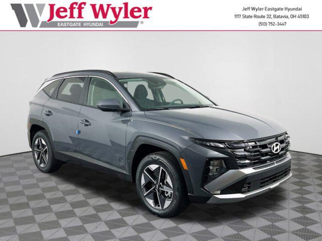 Ecotronic Gray 2026 Hyundai Tucson Hybrid 1.6L I4 DGI Hybrid Turbocharged DOHC 16V LEV3-SULEV30 AWD 6-Speed Automatic 37/36 City/Highway MPG Jeff Wyler Eastgate Auto Mall is honored to offer this gorgeous-looking 2026 Hyundai Tucson Hybrid in Ecotronic Gray. Well equipped with: Option Group 01, Tow & Go Package (Ball Mount Kit and Tow Hitch), 18" x 7.5J Alloy Wheels, 4-Wheel Disc Brakes, 6 Speakers, ABS brakes, Air Conditioning, Alloy wheels, AM/FM radio: SiriusXM, Apple CarPlay & Android Auto, Auto High-beam Headlights, Automatic temperature control, Brake assist, Bumpers: body-color, Cargo Cover, Cargo Net, Carpeted Floor Mats, Delay-off headlights, Driver door bin, Driver vanity mirror, Dual front impact airbags, Dual front side impact airbags, Electronic Stability Control, Emergency communication system: Bluelink+, Four wheel independent suspension, Front anti-roll bar, Front Bucket Seats, Front Center Armrest, Front dual zone A/C, Front reading lights, Fully automatic headlights, Heated door mirrors, Heated Front Bucket Seats, Heated front seats, Illuminated entry, Low tire pressure warning, Occupant sensing airbag, Outside temperature display, Overhead airbag, Overhead console, Panic alarm, Passenger door bin, Passenger vanity mirror, Power door mirrors, Power driver seat, Power Liftgate, Power steering, Power windows, Radio data system, Radio: AM/FM/HD Audio System, Rear anti-roll bar, Rear reading lights, Rear seat center armrest, Rear side impact airbag, Rear window defroster, Rear window wiper, Remote keyless entry, Security system, Speed control, Split folding rear seat, Spoiler, Stain & Odor Resistant Cloth Seat Trim, Steering wheel mounted audio controls, Tachometer, Telescoping steering wheel, Tilt steering wheel, Traction control, Trip computer, and Variably intermittent wipers. 37/36 City/Highway MPG