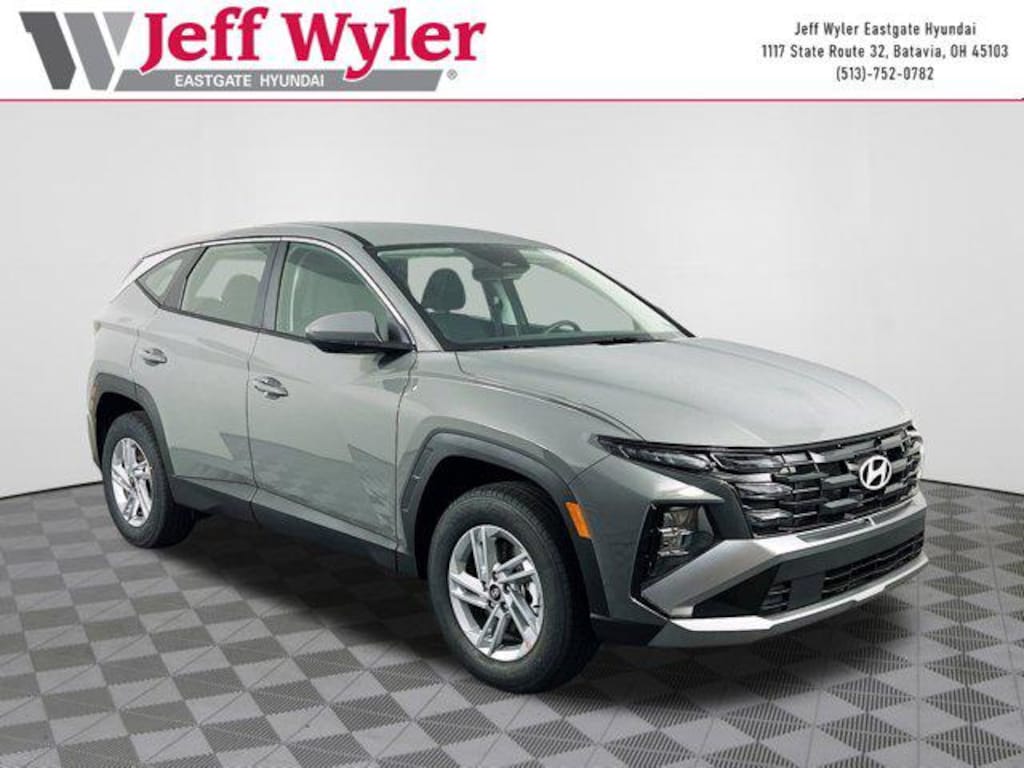 Hampton Gray 2026 Hyundai Tucson SE 2.5L I4 DGI DOHC 16V LEV3-SULEV30 187hp AWD 8-Speed Automatic with SHIFTRONIC 24/30 City/Highway MPG Jeff Wyler Eastgate Auto Mall is excited to offer this good-looking 2026 Hyundai Tucson SE in Hampton Gray. Well equipped with: Option Group 01, 17" x 7.0J Alloy Wheels, 4-Wheel Disc Brakes, 6 Speakers, ABS brakes, Air Conditioning, Alloy wheels, AM/FM radio: SiriusXM, Apple CarPlay & Android Auto, Auto High-beam Headlights, Brake assist, Bumpers: body-color, Cargo Cover, Cargo Net, Carpeted Floor Mats, Delay-off headlights, Driver door bin, Driver vanity mirror, Dual front impact airbags, Dual front side impact airbags, Electronic Stability Control, Emergency communication system: Bluelink+, First Aid Kit, Four wheel independent suspension, Front anti-roll bar, Front Bucket Seats, Front Center Armrest, Front reading lights, Fully automatic headlights, Illuminated entry, Low tire pressure warning, Occupant sensing airbag, Outside temperature display, Overhead airbag, Overhead console, Panic alarm, Passenger door bin, Passenger vanity mirror, Power door mirrors, Power steering, Power windows, Radio data system, Radio: AM/FM/HD Audio System, Rear anti-roll bar, Rear reading lights, Rear seat center armrest, Rear side impact airbag, Rear window defroster, Rear window wiper, Remote keyless entry, Security system, Speed control, Split folding rear seat, Spoiler, Stain & Odor Resistant Cloth Seat Trim, Steering wheel mounted audio controls, Tachometer, Telescoping steering wheel, Tilt steering wheel, Tow Hitch, Traction control, Trip computer, and Variably intermittent wipers. 24/30 City/Highway MPG