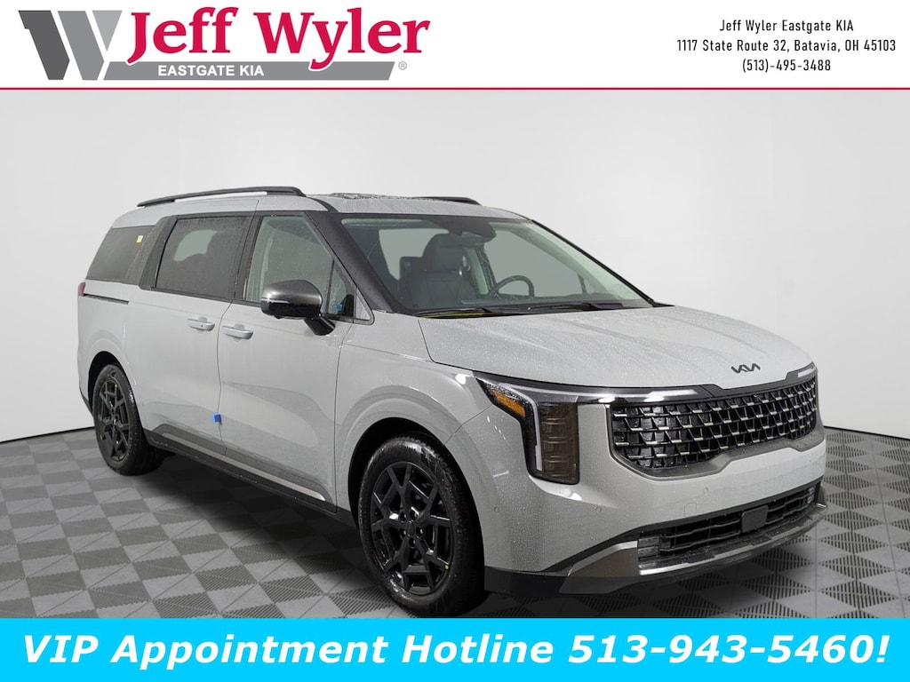 Ceramic Silver 2025 Kia Carnival SX Prestige V6 FWD 8-Speed Automatic 18/26 City/Highway MPG Jeff Wyler Eastgate Auto Mall is pumped up to offer this good-looking 2025 Kia Carnival SX Prestige in Ceramic Silver. Well equipped with: Rear Seat Entertainment Package, SX Prestige Seat Package (2nd Row Laminated Windows, Ambient Lighting, Heated/Ventilated 2nd Row Power VIP Lounge Seats, and High Glossy Interior Trim), 12 Speakers, 3.51 Axle Ratio, 3rd row seats: split-bench, 4-Wheel Disc Brakes, ABS brakes, Air Conditioning, Alloy wheels, AM/FM radio: SiriusXM, Apple CarPlay & Android Auto, Auto High-beam Headlights, Auto-dimming Rear-View mirror, Automatic temperature control, Brake assist, Bumpers: body-color, Compass, Delay-off headlights, Driver door bin, Driver vanity mirror, Dual front impact airbags, Dual front side impact airbags, Electronic Stability Control, Emergency communication system, Exterior Parking Camera Rear, Four wheel independent suspension, Front anti-roll bar, Front Bucket Seats, Front Center Armrest, Front dual zone A/C, Front fog lights, Front reading lights, Fully automatic headlights, Garage door transmitter: HomeLink, Heads-Up Display, Heated & Ventilated Front Bucket Seats, Heated door mirrors, Heated front seats, Heated steering wheel, Illuminated entry, Knee airbag, Leather Shift Knob, Leather steering wheel, Low tire pressure warning, Luxury Carpeted Floor Mats, Memory seat, Navigation system: AVN 5.0 Navigation System, Occupant sensing airbag, Outside temperature display, Overhead airbag, Overhead console, Panic alarm, Passenger door bin, Passenger vanity mirror, Power 2nd-Row Moonroof, Power door mirrors, Power driver seat, Power Liftgate, Power moonroof, Power passenger seat, Power steering, Power windows, Pure Leather Seat Trim, Radio: AM/FM/HD Audio System, Rain sensing wipers, Rear air conditioning, Rear anti-roll bar, Rear reading lights, Rear window defroster, Rear window wiper, Reclining 3rd row seat, Remote keyless entry, Security system, Speed control, Speed-sensing steering, Split folding rear seat, Spoiler, Steering wheel mounted audio controls, Tachometer, Telescoping steering wheel, Tilt steering wheel, Traction control, Trailer Prewire Harness, Trip computer, Turn signal indicator mirrors, Variably intermittent wipers, Ventilated front seats, and Wheels: 7.5J x 19" Alloy Dark Edition. 18/26 City/Highway MPG