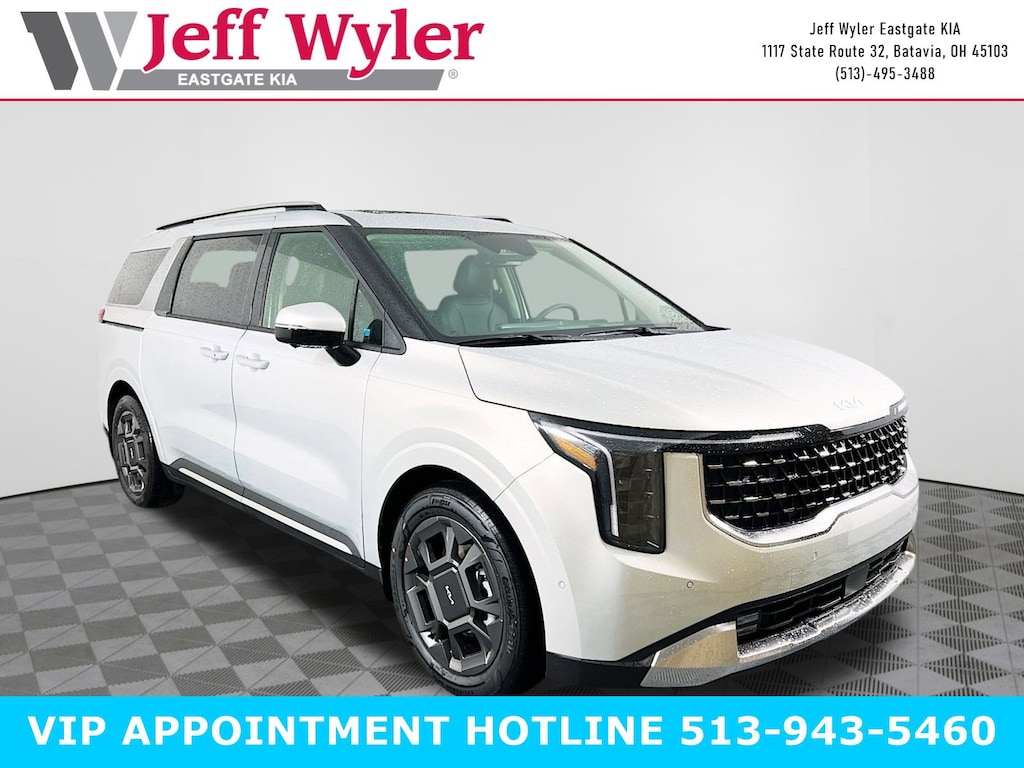 Priced below KBB Fair Purchase Price! Ivory Silver 2025 Kia Carnival SX V6 FWD 8-Speed Automatic 18/26 City/Highway MPG Jeff Wyler Eastgate Auto Mall is very proud to offer this outstanding 2025 Kia Carnival SX in Ivory Silver. Well equipped with: 3.51 Axle Ratio, 3rd row seats: split-bench, 4-Wheel Disc Brakes, 8 Speakers, ABS brakes, Air Conditioning, Alloy wheels, AM/FM radio: SiriusXM, Apple CarPlay & Android Auto, Artificial Leather Seat Trim, Auto High-beam Headlights, Automatic temperature control, Brake assist, Bumpers: body-color, Carpeted Floor Mats (8-Passenger), Compass, Delay-off headlights, Driver door bin, Driver vanity mirror, Dual front impact airbags, Dual front side impact airbags, EC Mirror w/HomeLink, Electronic Stability Control, Emergency communication system, Exterior Parking Camera Rear, Four wheel independent suspension, Front anti-roll bar, Front Bucket Seats, Front Center Armrest, Front dual zone A/C, Front fog lights, Front reading lights, Fully automatic headlights, Heated & Ventilated Front Bucket Seats, Heated door mirrors, Heated front seats, Illuminated entry, Knee airbag, Leather Shift Knob, Leather steering wheel, Low tire pressure warning, Memory seat, Mud Guards, Navigation system: AVN 5.0 Navigation System, Occupant sensing airbag, Outside temperature display, Overhead airbag, Overhead console, Panic alarm, Passenger door bin, Passenger vanity mirror, Power 2nd-Row Moonroof, Power door mirrors, Power driver seat, Power Liftgate, Power moonroof, Power passenger seat, Power steering, Power windows, Radio: AM/FM/HD Audio System, Rain sensing wipers, Rear air conditioning, Rear anti-roll bar, Rear reading lights, Rear window defroster, Rear window wiper, Reclining 3rd row seat, Remote keyless entry, Security system, Speed control, Speed-sensing steering, Split folding rear seat, Spoiler, Steering wheel mounted audio controls, Tachometer, Telescoping steering wheel, Tilt steering wheel, Traction control, Trailer Prewire Harness, Trip computer, Turn signal indicator mirrors, Variably intermittent wipers, Ventilated front seats, Wheels: 7.5J x 19" Alloy, and Wheels: 7.5J x 19" Alloy Dark Edition. 18/26 City/Highway MPG