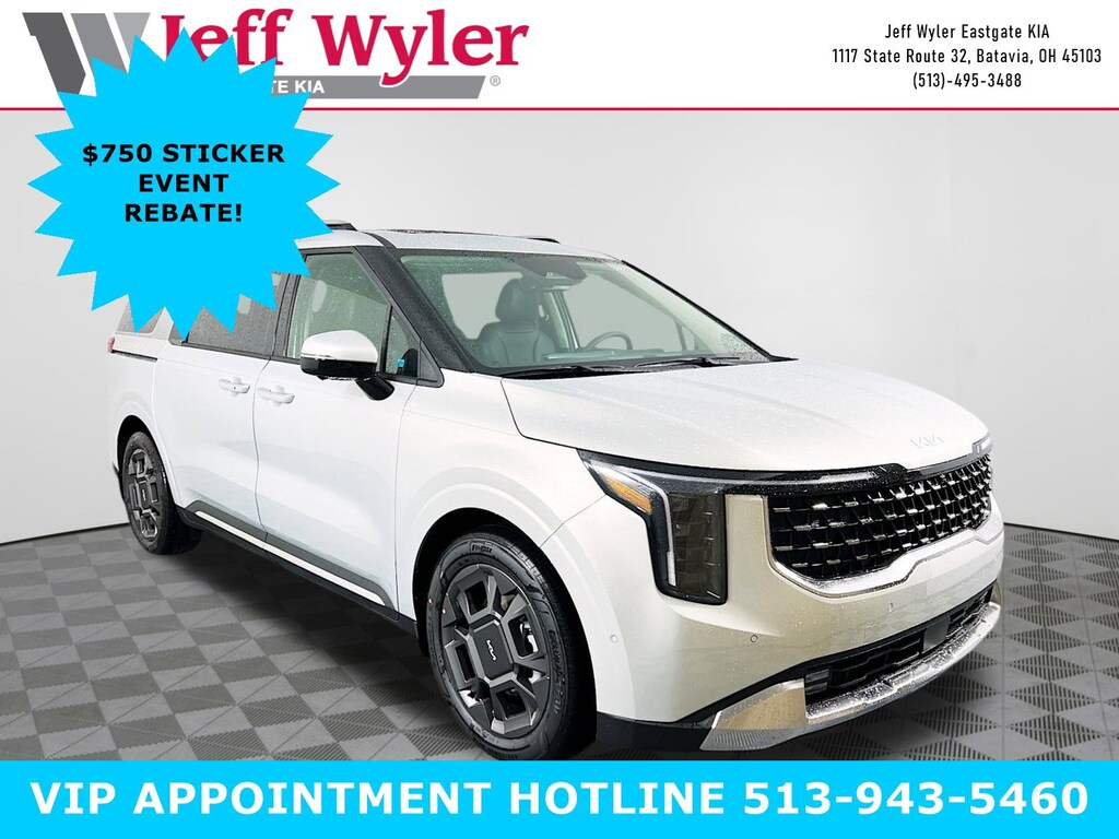 Priced below KBB Fair Purchase Price! Ivory Silver 2025 Kia Carnival SX V6 FWD 8-Speed Automatic 18/26 City/Highway MPG Jeff Wyler Eastgate Auto Mall is proud to offer this beautiful 2025 Kia Carnival SX in Ivory Silver. Well equipped with: 3.51 Axle Ratio, 3rd row seats: split-bench, 4-Wheel Disc Brakes, 8 Speakers, ABS brakes, Air Conditioning, Alloy wheels, AM/FM radio: SiriusXM, Apple CarPlay & Android Auto, Artificial Leather Seat Trim, Auto High-beam Headlights, Automatic temperature control, Brake assist, Bumpers: body-color, Carpeted Floor Mats (8-Passenger), Compass, Delay-off headlights, Driver door bin, Driver vanity mirror, Dual front impact airbags, Dual front side impact airbags, EC Mirror w/HomeLink, Electronic Stability Control, Emergency communication system, Exterior Parking Camera Rear, Four wheel independent suspension, Front anti-roll bar, Front Bucket Seats, Front Center Armrest, Front dual zone A/C, Front fog lights, Front reading lights, Fully automatic headlights, Heated & Ventilated Front Bucket Seats, Heated door mirrors, Heated front seats, Illuminated entry, Knee airbag, Leather Shift Knob, Leather steering wheel, Low tire pressure warning, Memory seat, Mud Guards, Navigation system: AVN 5.0 Navigation System, Occupant sensing airbag, Outside temperature display, Overhead airbag, Overhead console, Panic alarm, Passenger door bin, Passenger vanity mirror, Power 2nd-Row Moonroof, Power door mirrors, Power driver seat, Power Liftgate, Power moonroof, Power passenger seat, Power steering, Power windows, Radio: AM/FM/HD Audio System, Rain sensing wipers, Rear air conditioning, Rear anti-roll bar, Rear reading lights, Rear window defroster, Rear window wiper, Reclining 3rd row seat, Remote keyless entry, Security system, Speed control, Speed-sensing steering, Split folding rear seat, Spoiler, Steering wheel mounted audio controls, Tachometer, Telescoping steering wheel, Tilt steering wheel, Traction control, Trailer Prewire Harness, Trip computer, Turn signal indicator mirrors, Variably intermittent wipers, Ventilated front seats, Wheels: 7.5J x 19" Alloy, and Wheels: 7.5J x 19" Alloy Dark Edition. 18/26 City/Highway MPG