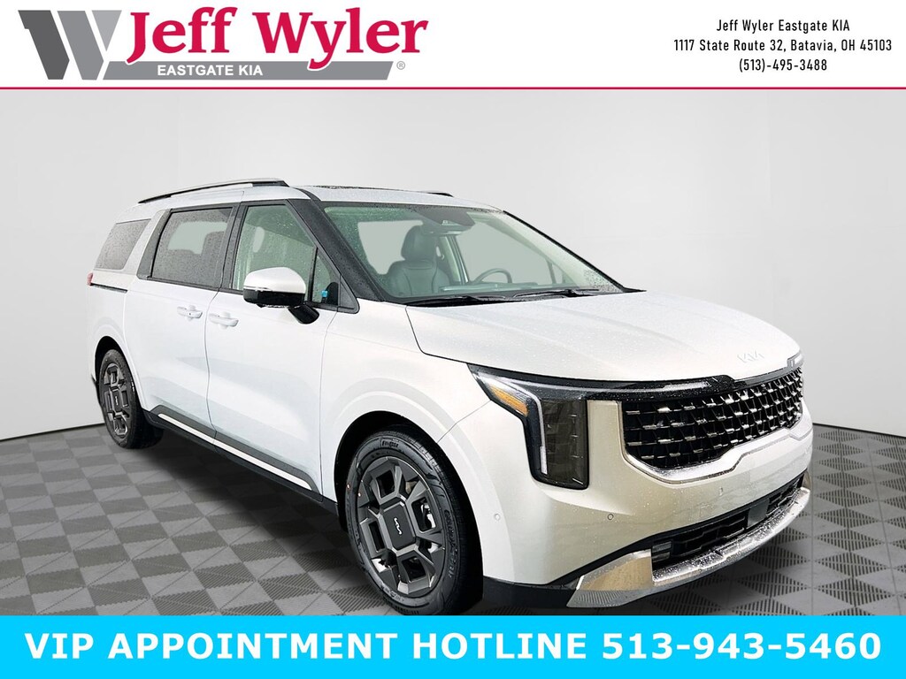 Priced below KBB Fair Purchase Price! Ivory Silver 2025 Kia Carnival SX V6 FWD 8-Speed Automatic 18/26 City/Highway MPG Jeff Wyler Eastgate Auto Mall is very proud to offer this outstanding 2025 Kia Carnival SX in Ivory Silver. Well equipped with: 3.51 Axle Ratio, 3rd row seats: split-bench, 4-Wheel Disc Brakes, 8 Speakers, ABS brakes, Air Conditioning, Alloy wheels, AM/FM radio: SiriusXM, Apple CarPlay & Android Auto, Artificial Leather Seat Trim, Auto High-beam Headlights, Automatic temperature control, Brake assist, Bumpers: body-color, Carpeted Floor Mats (8-Passenger), Compass, Delay-off headlights, Driver door bin, Driver vanity mirror, Dual front impact airbags, Dual front side impact airbags, EC Mirror w/HomeLink, Electronic Stability Control, Emergency communication system, Exterior Parking Camera Rear, Four wheel independent suspension, Front anti-roll bar, Front Bucket Seats, Front Center Armrest, Front dual zone A/C, Front fog lights, Front reading lights, Fully automatic headlights, Heated & Ventilated Front Bucket Seats, Heated door mirrors, Heated front seats, Illuminated entry, Knee airbag, Leather Shift Knob, Leather steering wheel, Low tire pressure warning, Memory seat, Mud Guards, Navigation system: AVN 5.0 Navigation System, Occupant sensing airbag, Outside temperature display, Overhead airbag, Overhead console, Panic alarm, Passenger door bin, Passenger vanity mirror, Power 2nd-Row Moonroof, Power door mirrors, Power driver seat, Power Liftgate, Power moonroof, Power passenger seat, Power steering, Power windows, Radio: AM/FM/HD Audio System, Rain sensing wipers, Rear air conditioning, Rear anti-roll bar, Rear reading lights, Rear window defroster, Rear window wiper, Reclining 3rd row seat, Remote keyless entry, Security system, Speed control, Speed-sensing steering, Split folding rear seat, Spoiler, Steering wheel mounted audio controls, Tachometer, Telescoping steering wheel, Tilt steering wheel, Traction control, Trailer Prewire Harness, Trip computer, Turn signal indicator mirrors, Variably intermittent wipers, Ventilated front seats, Wheels: 7.5J x 19" Alloy, and Wheels: 7.5J x 19" Alloy Dark Edition. 18/26 City/Highway MPG