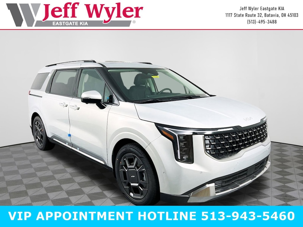 Ivory Silver 2025 Kia Carnival SX V6 FWD 8-Speed Automatic 18/26 City/Highway MPG Jeff Wyler Eastgate Auto Mall is pumped up to offer this stunning 2025 Kia Carnival SX in Ivory Silver. Well equipped with: 3.51 Axle Ratio, 3rd row seats: split-bench, 4-Wheel Disc Brakes, 8 Speakers, ABS brakes, Air Conditioning, Alloy wheels, AM/FM radio: SiriusXM, Apple CarPlay & Android Auto, Artificial Leather Seat Trim, Auto High-beam Headlights, Automatic temperature control, Brake assist, Bumpers: body-color, Carpeted Floor Mats (8-Passenger), Compass, Delay-off headlights, Driver door bin, Driver vanity mirror, Dual front impact airbags, Dual front side impact airbags, Electronic Stability Control, Emergency communication system, Exterior Parking Camera Rear, Four wheel independent suspension, Front anti-roll bar, Front Bucket Seats, Front Center Armrest, Front dual zone A/C, Front fog lights, Front reading lights, Fully automatic headlights, Heated & Ventilated Front Bucket Seats, Heated door mirrors, Heated front seats, Illuminated entry, Knee airbag, Leather Shift Knob, Leather steering wheel, Low tire pressure warning, Memory seat, Mud Guards, Navigation system: AVN 5.0 Navigation System, Occupant sensing airbag, Outside temperature display, Overhead airbag, Overhead console, Panic alarm, Passenger door bin, Passenger vanity mirror, Power 2nd-Row Moonroof, Power door mirrors, Power driver seat, Power Liftgate, Power moonroof, Power passenger seat, Power steering, Power windows, Radio: AM/FM/HD Audio System, Rain sensing wipers, Rear air conditioning, Rear anti-roll bar, Rear reading lights, Rear window defroster, Rear window wiper, Reclining 3rd row seat, Remote keyless entry, Security system, Speed control, Speed-sensing steering, Split folding rear seat, Spoiler, Steering wheel mounted audio controls, Tachometer, Telescoping steering wheel, Tilt steering wheel, Traction control, Trailer Prewire Harness, Trip computer, Turn signal indicator mirrors, Variably intermittent wipers, Ventilated front seats, Wheels: 7.5J x 19" Alloy, and Wheels: 7.5J x 19" Alloy Dark Edition. 18/26 City/Highway MPG