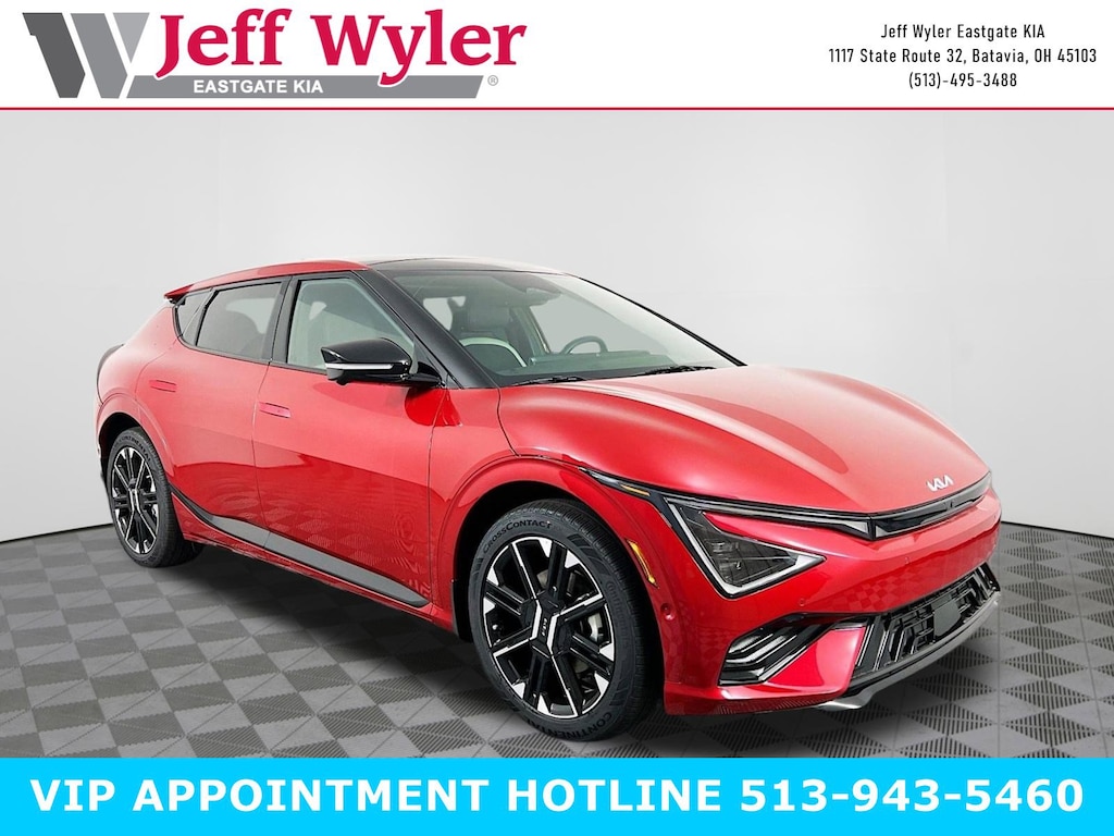 Priced below KBB Fair Purchase Price! Runway Red 2025 Kia EV6 GT-Line Electric Motor AWD 1-Speed Automatic 106/89 City/Highway MPG Jeff Wyler Eastgate Auto Mall is pumped up to offer this great-looking 2025 Kia EV6 GT-Line in Runway Red. Well equipped with: GT-Line SynTex Suede Seat Package (Black Seat Color w/Off-White Accent and SynTex Suede Seat Trim w/Vegan Leather Accents), 14 Speakers, 4-Wheel Disc Brakes, ABS brakes, Air Conditioning, Alloy wheels, AM/FM radio: SiriusXM, Apple CarPlay & Android Auto, Auto High-beam Headlights, Auto-dimming Rear-View mirror, Automatic temperature control, Brake assist, Bumpers: body-color, Cargo Cover, Carpeted Floor Mats, Delay-off headlights, Driver door bin, Driver vanity mirror, Dual front impact airbags, Dual front side impact airbags, Electronic Stability Control, Emergency communication system, Four wheel independent suspension, Front anti-roll bar, Front Bucket Seats, Front Center Armrest, Front dual zone A/C, Front reading lights, Fully automatic headlights, Garage door transmitter: HomeLink, GT-Line Mud Guards, Heads-Up Display, Heated & Ventilated Front Seats (3-Stage), Heated door mirrors, Heated front seats, Heated rear seats, Heated steering wheel, Illuminated entry, Knee airbag, Low tire pressure warning, Memory seat, Navigation system: AVN 5.0 Navigation System, Occupant sensing airbag, Outside temperature display, Overhead airbag, Overhead console, Panic alarm, Passenger door bin, Passenger vanity mirror, Power door mirrors, Power driver seat, Power Liftgate, Power moonroof, Power passenger seat, Power steering, Power windows, Radio: Meridian Premium Audio System, Rain sensing wipers, Rear anti-roll bar, Rear seat center armrest, Rear side impact airbag, Rear window defroster, Remote keyless entry, Security system, Speed control, Speed-sensing steering, Split folding rear seat, Spoiler, Sport steering wheel, Steering wheel mounted audio controls, Telescoping steering wheel, Tilt steering wheel, Traction control, Trip computer, Turn signal indicator mirrors, Variably intermittent wipers, Vegan Leather Seat Trim, Ventilated front seats, and Wheels: 8.0J x 20" Black Painted Alloy. 106/89 City/Highway MPG Price includes: $10000 - Kia Customer Cash. Exp. 03/02/2026