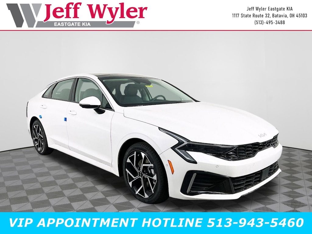 Priced below KBB Fair Purchase Price! Snow White Pearl 2025 Kia K5 EX I4 FWD 8-Speed Automatic 25/36 City/Highway MPG Jeff Wyler Eastgate Auto Mall is excited to offer this charming 2025 Kia K5 EX in Snow White Pearl. Well equipped with: 12 Speakers, 4-Wheel Disc Brakes, ABS brakes, Air Conditioning, Alloy wheels, AM/FM radio: SiriusXM, Auto High-beam Headlights, Automatic temperature control, Brake assist, Bumpers: body-color, Carpeted Floor Mats, Delay-off headlights, Driver door bin, Driver vanity mirror, Dual front impact airbags, Dual front side impact airbags, Electronic Stability Control, Emergency communication system: Kia Connect (includes 1 year free trial), Four wheel independent suspension, Front anti-roll bar, Front Bucket Seats, Front Center Armrest, Front dual zone A/C, Front reading lights, Fully automatic headlights, Heated & Ventilated Front Bucket Seats, Heated door mirrors, Heated front seats, Heated steering wheel, Illuminated entry, Knee airbag, Leather Shift Knob, Leather steering wheel, Low tire pressure warning, Memory seat, Navigation System, Occupant sensing airbag, Outside temperature display, Overhead airbag, Overhead console, Panic alarm, Passenger door bin, Passenger vanity mirror, Power door mirrors, Power driver seat, Power moonroof, Power passenger seat, Power steering, Power windows, Radio data system, Radio: AM/FM Audio System, Rear anti-roll bar, Rear reading lights, Rear seat center armrest, Rear side impact airbag, Rear window defroster, Remote keyless entry, Security system, Speed control, Speed-sensing steering, Split folding rear seat, Steering wheel mounted audio controls, SynTex Seat Trim, Tachometer, Telescoping steering wheel, Tilt steering wheel, Traction control, Trip computer, Turn signal indicator mirrors, Variably intermittent wipers, Ventilated front seats, and Wheels: 18" x 7.5J Gloss Black Machined Finish Alloy. 25/36 City/Highway MPG