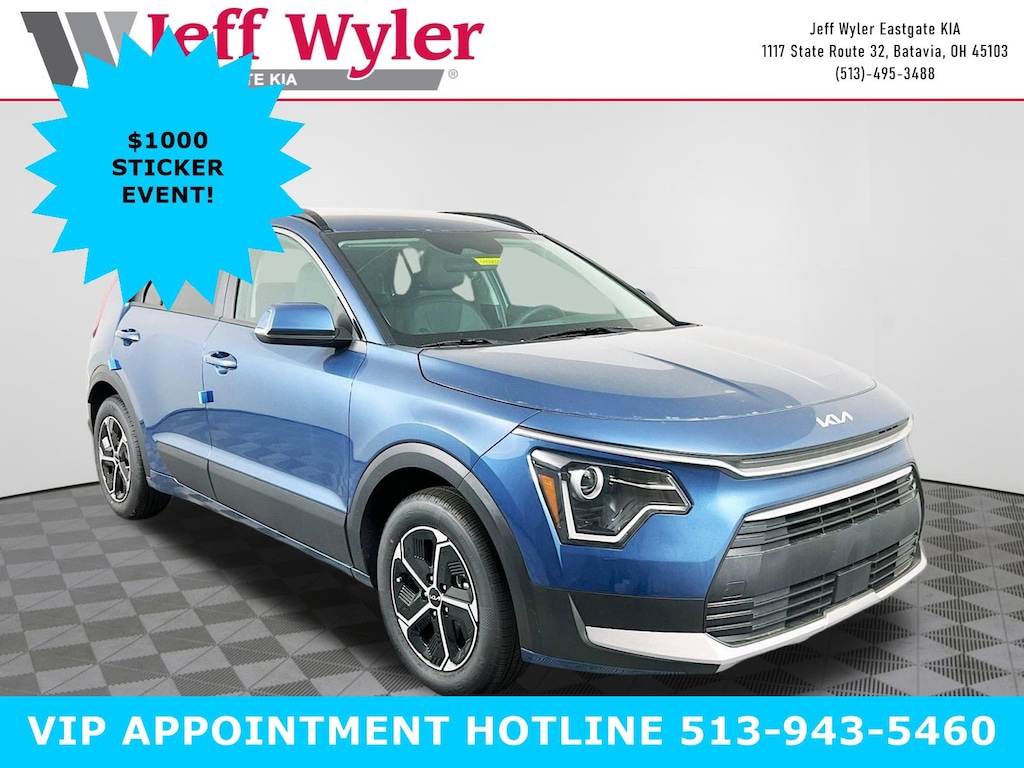Priced below KBB Fair Purchase Price! Mineral Blue 2025 Kia Niro EX 1.6L I4 DGI Hybrid DOHC 16V LEV3-SULEV30 FWD 6-Speed Dual Clutch 53/54 City/Highway MPG Jeff Wyler Eastgate Auto Mall is honored to offer this superb 2025 Kia Niro EX in Mineral Blue. Well equipped with: 2-Level Cargo Mat, 4-Wheel Disc Brakes, 6 Speakers, ABS brakes, Air Conditioning, Alloy wheels, AM/FM radio: SiriusXM, Apple CarPlay & Android Auto, Auto High-beam Headlights, Automatic temperature control, Brake assist, Bumpers: body-color, Cargo Net, Carpeted Floor Mats, Cloth & Vegan Leather-Trimmed Seats, Delay-off headlights, Driver door bin, Driver vanity mirror, Dual front impact airbags, Dual front side impact airbags, Electronic Stability Control, Emergency communication system: Kia Connect (includes 1 year free trial), Exterior Parking Camera Rear, Four wheel independent suspension, Front anti-roll bar, Front Bucket Seats, Front Center Armrest, Front dual zone A/C, Front reading lights, Fully automatic headlights, Heated door mirrors, Heated Front Bucket Seats (3-Steps), Heated front seats, Illuminated entry, Knee airbag, Leather Shift Knob, Low tire pressure warning, Navigation System, Occupant sensing airbag, Outside temperature display, Overhead airbag, Overhead console, Panic alarm, Passenger door bin, Passenger vanity mirror, Power door mirrors, Power driver seat, Power steering, Power windows, Radio: AM/FM/HD/SiriusXM, Rain sensing wipers, Rear anti-roll bar, Rear seat center armrest, Rear window defroster, Rear window wiper, Remote keyless entry, Security system, Speed control, Speed-sensing steering, Split folding rear seat, Spoiler, Steering wheel mounted audio controls, Telescoping steering wheel, Tilt steering wheel, Traction control, Trip computer, Turn signal indicator mirrors, Variably intermittent wipers, and Wheels: 6.5J x 16" Aero Alloy. 53/54 City/Highway MPG Price includes: $1000 - Sticker Sales Event Retail Bonus Cash. Exp. 01/02/2026