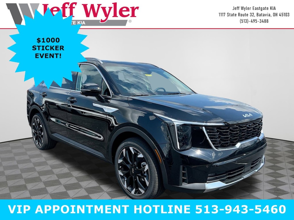 Priced below KBB Fair Purchase Price! Ebony Black 2025 Kia Sorento SX 2.5L I4 DGI Turbocharged DOHC 16V LEV3-SULEV30 281hp FWD 8 Speed Dual Clutch 20/29 City/Highway MPG Jeff Wyler Eastgate Auto Mall is proud to offer this superb-looking 2025 Kia Sorento SX in Ebony Black. Well equipped with: 3rd row seats: split-bench, 4-Wheel Disc Brakes, 6 Speakers, ABS brakes, Air Conditioning, All Weather Mats, Alloy wheels, AM/FM radio: SiriusXM, Apple CarPlay & Android Auto, Auto High-beam Headlights, Auto-Dimming Mirror w/HomeLink (PnP), Auto-dimming Rear-View mirror, Automatic temperature control, Brake assist, Bumpers: body-color, Cross Bars, Delay-off headlights, Driver door bin, Driver vanity mirror, Dual front impact airbags, Dual front side impact airbags, Electronic Stability Control, Emergency communication system: 911 Connect, Exterior Parking Camera Rear, Four wheel independent suspension, Front anti-roll bar, Front Bucket Seats, Front Center Armrest, Front dual zone A/C, Front fog lights, Front reading lights, Fully automatic headlights, Heated & Ventilated Front Bucket Seats, Heated door mirrors, Heated front seats, Illuminated entry, Knee airbag, Leather Shift Knob, Leather steering wheel, Low tire pressure warning, Navigation System, Occupant sensing airbag, Outside temperature display, Overhead airbag, Overhead console, Panic alarm, Passenger door bin, Passenger vanity mirror, Power door mirrors, Power driver seat, Power Liftgate, Power moonroof, Power passenger seat, Power steering, Power windows, Radio data system, Radio: AM/FM Standard Sound System, Rain sensing wipers, Rear anti-roll bar, Rear reading lights, Rear side impact airbag, Rear window defroster, Rear window wiper, Remote keyless entry, Security system, Speed control, Speed-sensing steering, Split folding rear seat, Spoiler, Steering wheel mounted audio controls, SynTex Artificial Leather Seat Trim, Tachometer, Telescoping steering wheel, Tilt steering wheel, Traction control, Trip computer, Turn signal indicator mirrors, Variably intermittent wipers, Ventilated front seats, and Wheels: 20" Machine-Finished Gloss Black Alloy. 20/29 City/Highway MPG Price includes: $1000 - Sticker Sales Event Retail Bonus Cash. Exp. 01/02/2026