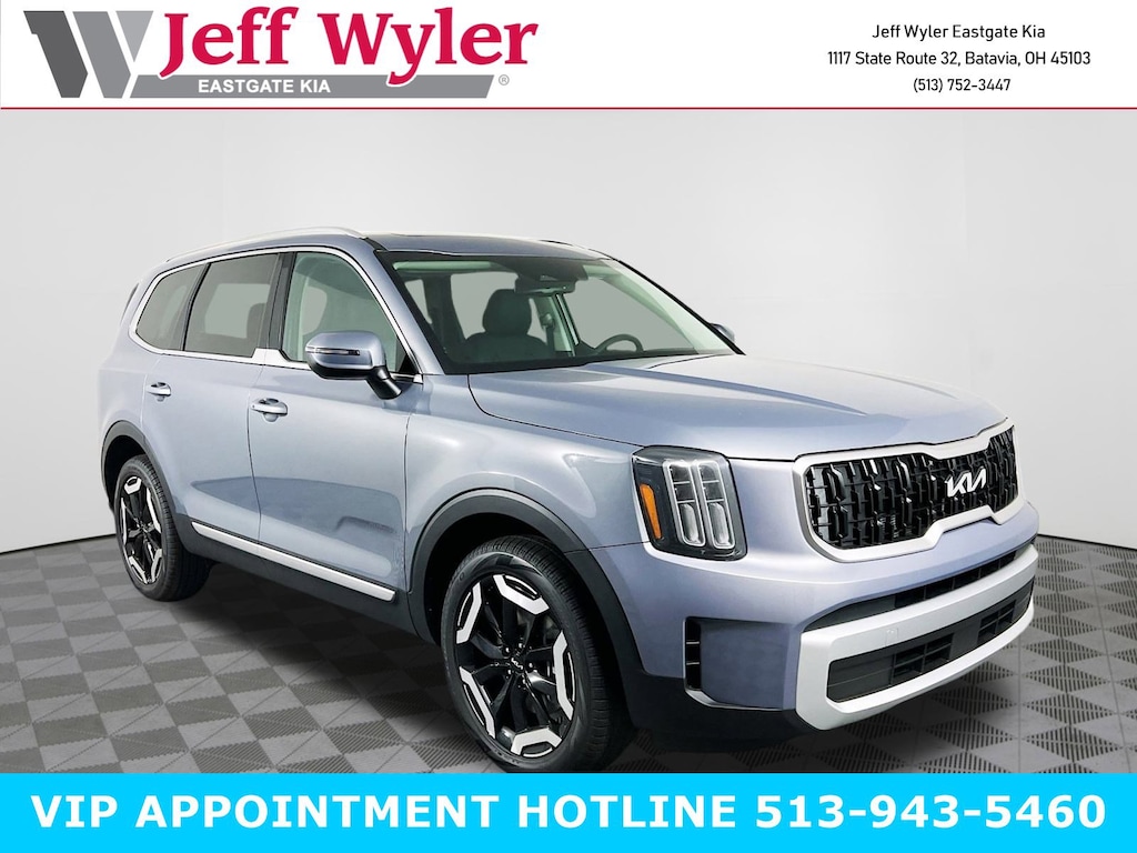 Everlasting Silver 2025 Kia Telluride EX 3.8L V6 DOHC FWD 8-Speed Automatic 20/26 City/Highway MPG Jeff Wyler Eastgate Auto Mall is very proud to offer this fantastic-looking 2025 Kia Telluride EX in Everlasting Silver. Well equipped with: EX Captain's Chair Package, 3rd row seats: split-bench, 4-Wheel Disc Brakes, 6 Speakers, ABS brakes, Air Conditioning, Alloy wheels, AM/FM radio: SiriusXM, Apple CarPlay & Android Auto, Auto High-beam Headlights, Auto-dimming Rear-View mirror, Automatic temperature control, Brake assist, Bumpers: body-color, Carpeted Floor Mats, Compass, Delay-off headlights, Driver door bin, Driver vanity mirror, Dual front impact airbags, Dual front side impact airbags, Electronic Stability Control, Emergency communication system: 911 Connect, Exterior Parking Camera Rear, Four wheel independent suspension, Front anti-roll bar, Front Bucket Seats, Front Center Armrest, Front dual zone A/C, Front reading lights, Fully automatic headlights, Heated & Ventilated Front Bucket Seats, Heated door mirrors, Heated front seats, Illuminated entry, Knee airbag, Leather Seat Trim, Leather Shift Knob, Leather steering wheel, Low tire pressure warning, Navigation System, Occupant sensing airbag, Outside temperature display, Overhead airbag, Overhead console, Panic alarm, Passenger door bin, Passenger vanity mirror, Power door mirrors, Power driver seat, Power Liftgate, Power moonroof, Power passenger seat, Power steering, Power windows, Radio data system, Radio: AM/FM Display Audio System, Rear air conditioning, Rear anti-roll bar, Rear audio controls, Rear reading lights, Rear seat center armrest, Rear side impact airbag, Rear window defroster, Rear window wiper, Reclining 3rd row seat, Remote keyless entry, Security system, Speed control, Speed-sensing steering, Split folding rear seat, Spoiler, Steering wheel mounted audio controls, Tachometer, Telescoping steering wheel, Tilt steering wheel, Traction control, Trip computer, Turn signal indicator mirrors, Variably intermittent wipers, Ventilated front seats, and Wheels: 20" x 7.5" Black Finish. 20/26 City/Highway MPG