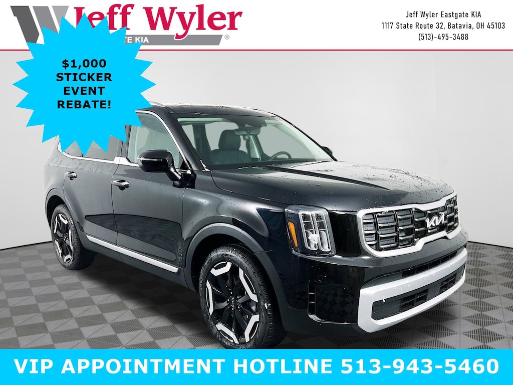 Priced below KBB Fair Purchase Price! Ebony Black 2025 Kia Telluride S 3.8L V6 DOHC AWD 8-Speed Automatic 18/23 City/Highway MPG Jeff Wyler Eastgate Auto Mall is very proud to offer this stunning-looking 2025 Kia Telluride S in Ebony Black. Well equipped with: 3rd row seats: split-bench, 4-Wheel Disc Brakes, 6 Speakers, ABS brakes, Air Conditioning, All Weather Floor Mats, Alloy wheels, AM/FM radio: SiriusXM, Apple CarPlay & Android Auto, Auto High-beam Headlights, Automatic temperature control, Brake assist, Bumpers: body-color, Delay-off headlights, Driver door bin, Driver vanity mirror, Dual front impact airbags, Dual front side impact airbags, Electronic Stability Control, Emergency communication system: 911 Connect, Exterior Parking Camera Rear, Four wheel independent suspension, Front anti-roll bar, Front Bucket Seats, Front Center Armrest, Front dual zone A/C, Front reading lights, Fully automatic headlights, Heated door mirrors, Heated Front Bucket Seats, Heated front seats, Illuminated entry, Knee airbag, Leather Shift Knob, Leather steering wheel, Low tire pressure warning, Navigation System, Occupant sensing airbag, Outside temperature display, Overhead airbag, Overhead console, Panic alarm, Passenger door bin, Passenger vanity mirror, Power door mirrors, Power driver seat, Power Liftgate, Power moonroof, Power steering, Power windows, Radio data system, Radio: AM/FM Display Audio System, Rear air conditioning, Rear anti-roll bar, Rear audio controls, Rear reading lights, Rear side impact airbag, Rear window defroster, Rear window wiper, Reclining 3rd row seat, Remote keyless entry, Security system, Speed control, Speed-sensing steering, Split folding rear seat, Spoiler, Steering wheel mounted audio controls, SynTex Synthetic Leather Seat Trim, Tachometer, Telescoping steering wheel, Tilt steering wheel, Traction control, Trip computer, Turn signal indicator mirrors, Variably intermittent wipers, and Wheels: 20" x 7.5" Black Finish. Price includes: $2000 - Kia Customer Cash. Exp. 02/02/2026
