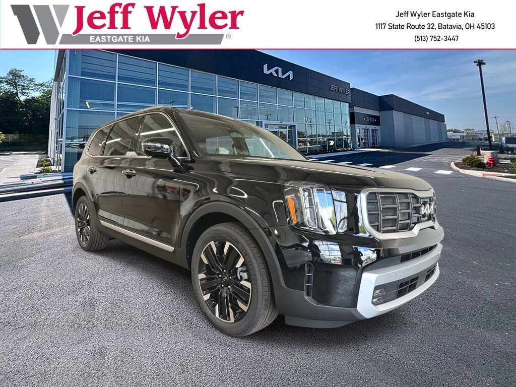 Ebony Black 2025 Kia Telluride SX 3.8L V6 DOHC AWD 8-Speed Automatic 18/23 City/Highway MPG Jeff Wyler Eastgate Auto Mall is pumped up to offer this gorgeous-looking 2025 Kia Telluride SX in Ebony Black. Well equipped with: Mahogany Interior Color Package, SX Captain's Chair Package (2nd Row Captain Chairs), 10 Speakers, 3rd row seats: split-bench, 4-Wheel Disc Brakes, ABS brakes, Air Conditioning, Alloy wheels, AM/FM radio: SiriusXM, Apple CarPlay & Android Auto, Auto High-beam Headlights, Auto-dimming Rear-View mirror, Auto-leveling suspension, Automatic temperature control, Brake assist, Bumpers: body-color, Carpeted Floor Mats, Compass, Delay-off headlights, Driver door bin, Driver vanity mirror, Dual front impact airbags, Dual front side impact airbags, Electronic Stability Control, Emergency communication system: 911 Connect, Exterior Parking Camera Rear, Four wheel independent suspension, Front anti-roll bar, Front Bucket Seats, Front Center Armrest, Front dual zone A/C, Front fog lights, Front reading lights, Fully automatic headlights, Garage door transmitter: HomeLink, harman/kardon® Speakers, Heated & Ventilated Front Bucket Seats, Heated door mirrors, Heated front seats, Illuminated entry, Knee airbag, Leather Seat Trim, Leather Shift Knob, Leather steering wheel, Low tire pressure warning, Memory seat, Navigation System, Occupant sensing airbag, Outside temperature display, Overhead airbag, Overhead console, Panic alarm, Passenger door bin, Passenger vanity mirror, Power door mirrors, Power driver seat, Power Liftgate, Power moonroof, Power passenger seat, Power steering, Power windows, Radio data system, Radio: AM/FM Harman Kardon Audio System, Rear air conditioning, Rear anti-roll bar, Rear audio controls, Rear reading lights, Rear seat center armrest, Rear side impact airbag, Rear window defroster, Rear window wiper, Reclining 3rd row seat, Remote keyless entry, Security system, Speed control, Speed-sensing steering, Split folding rear seat, Spoiler, Steering wheel mounted audio controls, Tachometer, Telescoping steering wheel, Tilt steering wheel, Traction control, Trip computer, Turn signal indicator mirrors, Variably intermittent wipers, Ventilated front seats, and Wheels: 20" x 7.5" Black Finish. Price includes: $750 - Sticker Sales Event Retail Bonus Cash. Exp. 12/01/2025