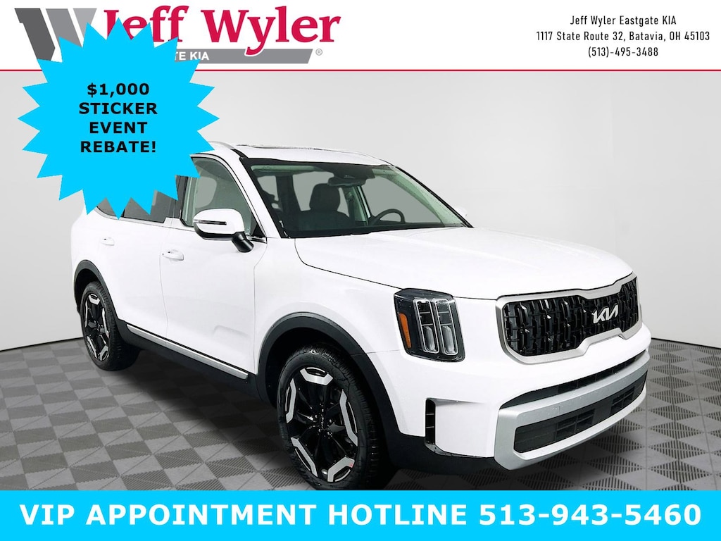 Glacial White Pearl 2025 Kia Telluride EX 3.8L V6 DOHC AWD 8-Speed Automatic 18/23 City/Highway MPG Jeff Wyler Eastgate Auto Mall is very proud to offer this terrific-looking 2025 Kia Telluride EX in Glacial White Pearl. Well equipped with: EX Captain's Chair Package (2nd Row Captain Chairs), 3rd row seats: split-bench, 4-Wheel Disc Brakes, 6 Speakers, ABS brakes, Air Conditioning, All Weather Floor Mats, Alloy wheels, AM/FM radio: SiriusXM, Apple CarPlay & Android Auto, Auto High-beam Headlights, Auto-dimming Rear-View mirror, Automatic temperature control, Brake assist, Bumpers: body-color, Compass, Delay-off headlights, Driver door bin, Driver vanity mirror, Dual front impact airbags, Dual front side impact airbags, Electronic Stability Control, Emergency communication system: 911 Connect, Exterior Parking Camera Rear, Four wheel independent suspension, Front anti-roll bar, Front Bucket Seats, Front Center Armrest, Front dual zone A/C, Front reading lights, Fully automatic headlights, Heated & Ventilated Front Bucket Seats, Heated door mirrors, Heated front seats, Illuminated entry, Knee airbag, Leather Seat Trim, Leather Shift Knob, Leather steering wheel, Low tire pressure warning, Navigation System, Occupant sensing airbag, Outside temperature display, Overhead airbag, Overhead console, Panic alarm, Passenger door bin, Passenger vanity mirror, Power door mirrors, Power driver seat, Power Liftgate, Power moonroof, Power passenger seat, Power steering, Power windows, Radio data system, Radio: AM/FM Display Audio System, Rear air conditioning, Rear anti-roll bar, Rear audio controls, Rear reading lights, Rear seat center armrest, Rear side impact airbag, Rear window defroster, Rear window wiper, Reclining 3rd row seat, Remote keyless entry, Security system, Speed control, Speed-sensing steering, Split folding rear seat, Spoiler, Steering wheel mounted audio controls, Tachometer, Telescoping steering wheel, Tilt steering wheel, Traction control, Trip computer, Turn signal indicator mirrors, Variably intermittent wipers, Ventilated front seats, and Wheels: 20" x 7.5" Black Finish. Price includes: $1000 - Sticker Sales Event Retail Bonus Cash. Exp. 01/02/2026