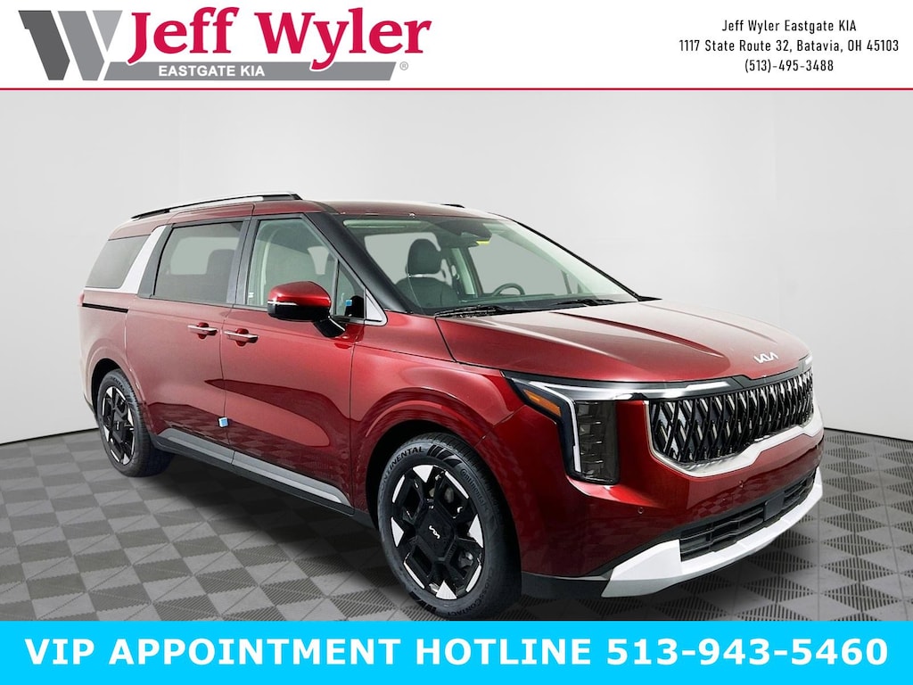 Flare Red 2026 Kia Carnival EX V6 FWD 8-Speed Automatic 18/26 City/Highway MPG Jeff Wyler Eastgate Auto Mall is very proud to offer this beautiful 2026 Kia Carnival EX in Flare Red. Well equipped with: 3.51 Axle Ratio, 3rd row seats: split-bench, 4-Wheel Disc Brakes, 8 Speakers, ABS brakes, Air Conditioning, All Weather Floor Mats (8-Passenger), Alloy wheels, AM/FM radio: SiriusXM, Apple CarPlay & Android Auto, Artificial Leather Seat Trim, Auto High-beam Headlights, Auto-Dimming Mirror with HomeLink, Automatic temperature control, Brake assist, Bumpers: body-color, Cargo Tray, Compass, Delay-off headlights, Driver door bin, Driver vanity mirror, Dual front impact airbags, Dual front side impact airbags, Electronic Stability Control, Emergency communication system, Exterior Parking Camera Rear, Four wheel independent suspension, Front anti-roll bar, Front Bucket Seats, Front Center Armrest, Front dual zone A/C, Front reading lights, Fully automatic headlights, Heated door mirrors, Heated Front Bucket Seats, Heated front seats, Illuminated entry, Knee airbag, Leather Shift Knob, Leather steering wheel, Low tire pressure warning, Memory seat, Navigation System, Occupant sensing airbag, Outside temperature display, Overhead airbag, Overhead console, Panic alarm, Passenger door bin, Passenger vanity mirror, Power door mirrors, Power driver seat, Power Liftgate, Power passenger seat, Power steering, Power windows, Radio: AM/FM/HD Audio System, Rear air conditioning, Rear anti-roll bar, Rear reading lights, Rear window defroster, Rear window wiper, Reclining 3rd row seat, Remote keyless entry, Security system, Small First Aid Kit, Speed control, Speed-sensing steering, Split folding rear seat, Spoiler, Steering wheel mounted audio controls, Tachometer, Telescoping steering wheel, Tilt steering wheel, Traction control, Trip computer, Turn signal indicator mirrors, Variably intermittent wipers, and Wheels: 7.5J x 19" Machine-Finished Alloy. 18/26 City/Highway MPG