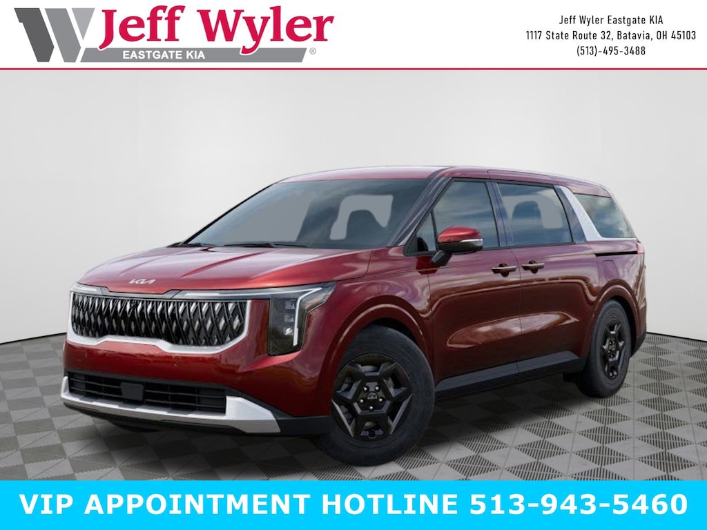 Flare Red 2026 Kia Carnival LXS V6 FWD 8-Speed Automatic 18/26 City/Highway MPG Jeff Wyler Eastgate Auto Mall is delighted to offer this attractive-looking 2026 Kia Carnival LXS in Flare Red. Well equipped with: 3.51 Axle Ratio, 3rd row seats: split-bench, 4-Wheel Disc Brakes, 6 Speakers, 6.5J x 17" Alloy Wheels, ABS brakes, Air Conditioning, Alloy wheels, AM/FM radio: SiriusXM, Apple CarPlay & Android Auto, Artificial Leather Seat Trim, Auto High-beam Headlights, Auto-Dimming Mirror w/HomeLink, Automatic temperature control, Brake assist, Bumpers: body-color, Carpeted Floor Mats (8-Passenger), Compass, Delay-off headlights, Driver door bin, Driver vanity mirror, Dual front impact airbags, Dual front side impact airbags, Electronic Stability Control, Emergency communication system, Exterior Parking Camera Rear, Four wheel independent suspension, Front anti-roll bar, Front Bucket Seats, Front Center Armrest, Front dual zone A/C, Front reading lights, Fully automatic headlights, Heated door mirrors, Heated Front Bucket Seats, Heated front seats, Illuminated entry, Knee airbag, Leather Shift Knob, Leather steering wheel, Low tire pressure warning, Navigation System, Occupant sensing airbag, Outside temperature display, Overhead airbag, Overhead console, Panic alarm, Passenger door bin, Passenger vanity mirror, Power door mirrors, Power driver seat, Power steering, Power windows, Radio: AM/FM/HD Audio System, Rear air conditioning, Rear anti-roll bar, Rear reading lights, Rear window defroster, Rear window wiper, Reclining 3rd row seat, Remote keyless entry, Security system, Speed control, Speed-sensing steering, Split folding rear seat, Spoiler, Steering wheel mounted audio controls, Tachometer, Telescoping steering wheel, Tilt steering wheel, Traction control, Trip computer, Turn signal indicator mirrors, and Variably intermittent wipers. 18/26 City/Highway MPG