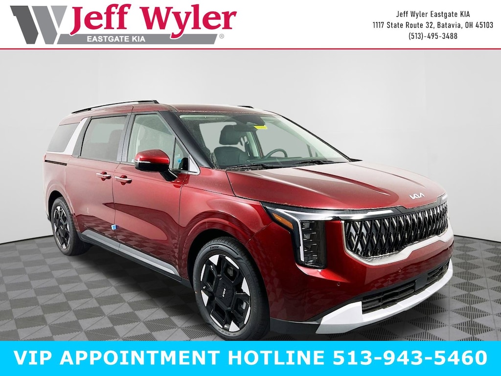 Flare Red 2026 Kia Carnival EX V6 FWD 8-Speed Automatic 18/26 City/Highway MPG Jeff Wyler Eastgate Auto Mall is pleased to offer this attractive-looking 2026 Kia Carnival EX in Flare Red. Well equipped with: 3.51 Axle Ratio, 3rd row seats: split-bench, 4-Wheel Disc Brakes, 8 Speakers, ABS brakes, Air Conditioning, Alloy wheels, AM/FM radio: SiriusXM, Apple CarPlay & Android Auto, Artificial Leather Seat Trim, Auto High-beam Headlights, Automatic temperature control, Brake assist, Bumpers: body-color, Carpeted Floor Mats (8-Passenger), Compass, Delay-off headlights, Driver door bin, Driver vanity mirror, Dual front impact airbags, Dual front side impact airbags, Electronic Stability Control, Emergency communication system, Exterior Parking Camera Rear, Four wheel independent suspension, Front anti-roll bar, Front Bucket Seats, Front Center Armrest, Front dual zone A/C, Front reading lights, Fully automatic headlights, Heated door mirrors, Heated Front Bucket Seats, Heated front seats, Illuminated entry, Knee airbag, Leather Shift Knob, Leather steering wheel, Low tire pressure warning, Memory seat, Navigation System, Occupant sensing airbag, Outside temperature display, Overhead airbag, Overhead console, Panic alarm, Passenger door bin, Passenger vanity mirror, Power door mirrors, Power driver seat, Power Liftgate, Power passenger seat, Power steering, Power windows, Radio: AM/FM/HD Audio System, Rear air conditioning, Rear anti-roll bar, Rear reading lights, Rear window defroster, Rear window wiper, Reclining 3rd row seat, Remote keyless entry, Security system, Speed control, Speed-sensing steering, Split folding rear seat, Spoiler, Steering wheel mounted audio controls, Tachometer, Telescoping steering wheel, Tilt steering wheel, Traction control, Trip computer, Turn signal indicator mirrors, Variably intermittent wipers, and Wheels: 7.5J x 19" Machine-Finished Alloy. 18/26 City/Highway MPG