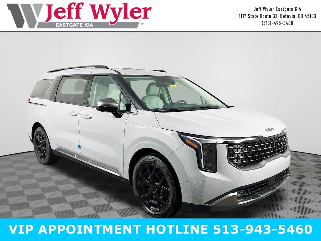 Ceramic Silver 2026 Kia Carnival Hybrid SX 1.6L I4 DGI Hybrid Turbocharged DOHC 16V LEV3-SULEV30 FWD 6-Speed Automatic 34/31 City/Highway MPG Jeff Wyler Eastgate Auto Mall is pumped up to offer this good-looking 2026 Kia Carnival Hybrid SX in Ceramic Silver. Well equipped with: SX Dark Edition Package (Dark Edition Interior Design and Wheels: 19" Black D-Cut Customizing), 3rd row seats: split-bench, 4-Wheel Disc Brakes, 8 Speakers, ABS brakes, Air Conditioning, Alloy wheels, AM/FM radio: SiriusXM, Apple CarPlay & Android Auto, Artificial Leather Seat Trim, Auto High-beam Headlights, Auto-Dimming Mirror w/HomeLink, Automatic temperature control, Brake assist, Bumpers: body-color, Carpeted Floor Mats (8-Passenger), Compass, Dark Edition Front Grille Trim, Dark Edition Mirror Caps, Dark Edition Roof Rails, Delay-off headlights, Driver door bin, Driver vanity mirror, Dual front impact airbags, Dual front side impact airbags, Electronic Stability Control, Emergency communication system, Exterior Parking Camera Rear, Four wheel independent suspension, Front anti-roll bar, Front Bucket Seats, Front Center Armrest, Front dual zone A/C, Front fog lights, Front reading lights, Fully automatic headlights, Heated & Ventilated Front Bucket Seats, Heated door mirrors, Heated front seats, Illuminated entry, Knee airbag, Leather Shift Knob, Leather steering wheel, Low tire pressure warning, Memory seat, Navigation System, Occupant sensing airbag, Outside temperature display, Overhead airbag, Overhead console, Panic alarm, Passenger door bin, Passenger vanity mirror, Power 2nd-Row Moonroof, Power door mirrors, Power driver seat, Power Liftgate, Power moonroof, Power passenger seat, Power steering, Power windows, Radio: Navigation System w/SiriusXM, Rain sensing wipers, Rear air conditioning, Rear anti-roll bar, Rear reading lights, Rear window defroster, Rear window wiper, Reclining 3rd row seat, Remote keyless entry, Security system, Speed control, Speed-sensing steering, Split folding rear seat, Spoiler, Steering wheel mounted audio controls, Tachometer, Telescoping steering wheel, Tilt steering wheel, Traction control, Trip computer, Turn signal indicator mirrors, Variably intermittent wipers, Ventilated front seats, and Wheels: 19" Black Alloy. 34/31 City/Highway MPG