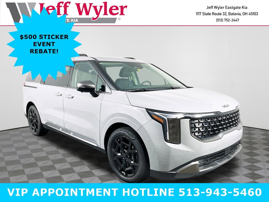 Priced below KBB Fair Purchase Price! Ceramic Silver 2026 Kia Carnival Hybrid SX Prestige 1.6L I4 DGI Hybrid Turbocharged DOHC 16V LEV3-SULEV30 FWD 6-Speed Automatic 34/31 City/Highway MPG Jeff Wyler Eastgate Auto Mall is honored to offer this superb 2026 Kia Carnival Hybrid SX Prestige in Ceramic Silver. Well equipped with: SX Prestige Seat Package (2nd Row Laminated Windows, Ambient Lighting, Heated/Ventilated 2nd Row Power VIP Lounge Seats, and High Glossy Interior Trim), 12 Speakers, 3rd row seats: split-bench, 4-Wheel Disc Brakes, ABS brakes, Air Conditioning, Alloy wheels, AM/FM radio: SiriusXM, Apple CarPlay & Android Auto, Auto High-beam Headlights, Auto-dimming Rear-View mirror, Automatic temperature control, Brake assist, Bumpers: body-color, Compass, Delay-off headlights, Driver door bin, Driver vanity mirror, Dual front impact airbags, Dual front side impact airbags, Electronic Stability Control, Emergency communication system, Exterior Parking Camera Rear, Four wheel independent suspension, Front anti-roll bar, Front Bucket Seats, Front Center Armrest, Front dual zone A/C, Front fog lights, Front reading lights, Fully automatic headlights, Garage door transmitter: HomeLink, Heads-Up Display, Heated & Ventilated Front Bucket Seats, Heated door mirrors, Heated front seats, Heated steering wheel, Illuminated entry, Knee airbag, Leather Seat Trim, Leather Shift Knob, Leather steering wheel, Low tire pressure warning, Memory seat, Navigation System, Occupant sensing airbag, Outside temperature display, Overhead airbag, Overhead console, Panic alarm, Passenger door bin, Passenger vanity mirror, Power 2nd-Row Moonroof, Power door mirrors, Power driver seat, Power Liftgate, Power moonroof, Power passenger seat, Power steering, Power windows, Radio: Navigation System w/SiriusXM, Rain sensing wipers, Rear air conditioning, Rear anti-roll bar, Rear reading lights, Rear window defroster, Rear window wiper, Reclining 3rd row seat, Remote keyless entry, Security system, Speed control, Speed-sensing steering, Split folding rear seat, Spoiler, Steering wheel mounted audio controls, Tachometer, Telescoping steering wheel, Tilt steering wheel, Traction control, Trip computer, Turn signal indicator mirrors, Variably intermittent wipers, Ventilated front seats, and Wheels: 19" Black D-Cut Customizing. 34/31 City/Highway MPG Price includes: $500 - Sticker Sales Event Retail Bonus Cash. Exp. 01/02/2026