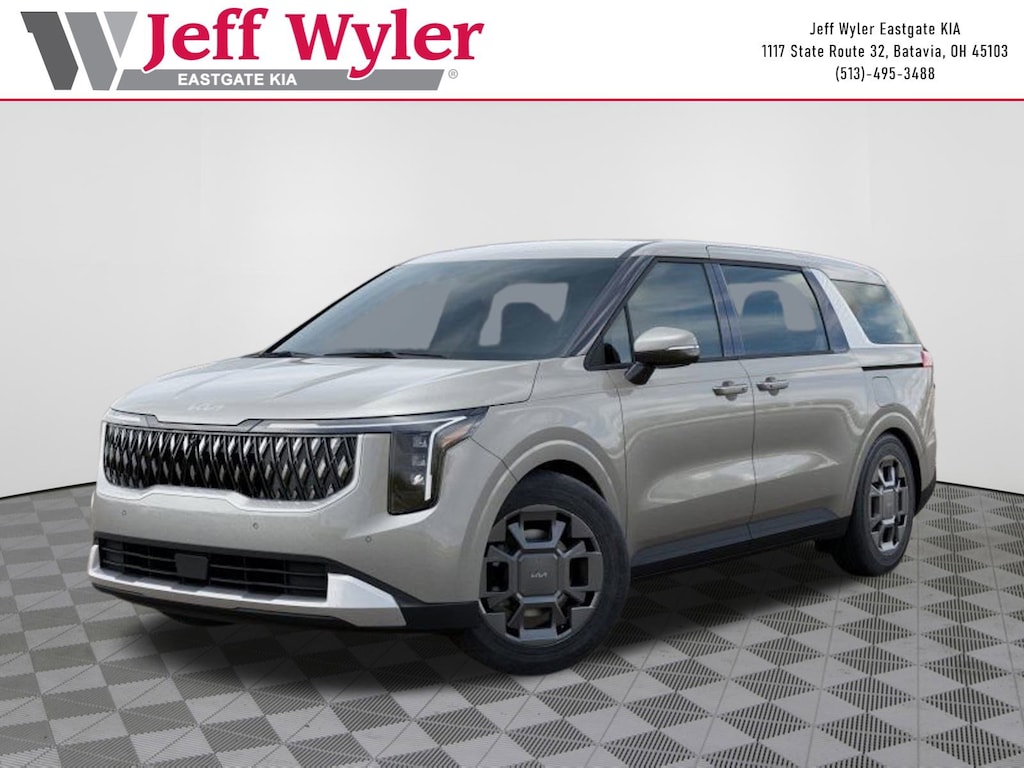 Ivory Silver 2026 Kia Carnival Hybrid EX 1.6L I4 DGI Hybrid Turbocharged DOHC 16V LEV3-SULEV30 FWD 6-Speed Automatic 34/31 City/Highway MPG Jeff Wyler Eastgate Auto Mall is delighted to offer this good-looking 2026 Kia Carnival Hybrid EX in Ivory Silver. Well equipped with: 3rd row seats: split-bench, 4-Wheel Disc Brakes, 8 Speakers, ABS brakes, Air Conditioning, All Weather Floor Mats (8-Passenger), Alloy wheels, AM/FM radio: SiriusXM, Apple CarPlay & Android Auto, Artificial Leather Seat Trim, Auto High-beam Headlights, Auto-Dimming Mirror with HomeLink, Automatic temperature control, Brake assist, Bumpers: body-color, Compass, Delay-off headlights, Driver door bin, Driver vanity mirror, Dual front impact airbags, Dual front side impact airbags, Electronic Stability Control, Emergency communication system, Exterior Parking Camera Rear, Four wheel independent suspension, Front anti-roll bar, Front Bucket Seats, Front Center Armrest, Front dual zone A/C, Front reading lights, Fully automatic headlights, Heated door mirrors, Heated Front Bucket Seats, Heated front seats, Illuminated entry, Knee airbag, Leather Shift Knob, Leather steering wheel, Low tire pressure warning, Memory seat, Navigation System, Occupant sensing airbag, Outside temperature display, Overhead airbag, Overhead console, Panic alarm, Passenger door bin, Passenger vanity mirror, Power door mirrors, Power driver seat, Power Liftgate, Power passenger seat, Power steering, Power windows, Radio: : Navigation System with SiriusXM, Rear air conditioning, Rear anti-roll bar, Rear reading lights, Rear window defroster, Rear window wiper, Reclining 3rd row seat, Remote keyless entry, Security system, Speed control, Speed-sensing steering, Split folding rear seat, Spoiler, Steering wheel mounted audio controls, Tachometer, Telescoping steering wheel, Tilt steering wheel, Traction control, Trip computer, Turn signal indicator mirrors, Variably intermittent wipers, and Wheels: 19" Black Alloy. 34/31 City/Highway MPG