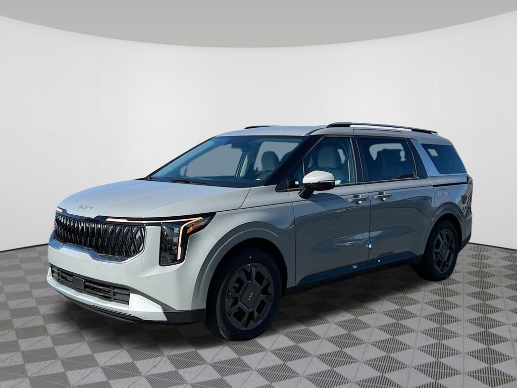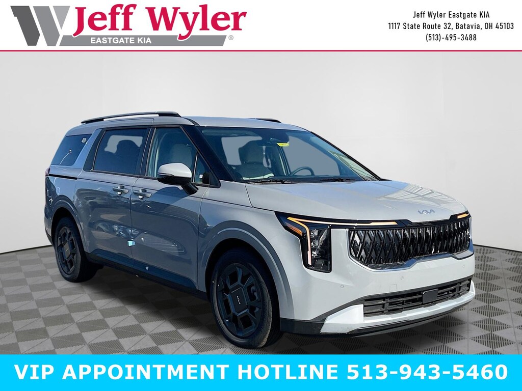 Ceramic Silver 2026 Kia Carnival Hybrid EX 1.6L I4 DGI Hybrid Turbocharged DOHC 16V LEV3-SULEV30 FWD 6-Speed Automatic 34/31 City/Highway MPG Jeff Wyler Eastgate Auto Mall is honored to offer this wonderful 2026 Kia Carnival Hybrid EX in Ceramic Silver. Well equipped with: 3rd row seats: split-bench, 4-Wheel Disc Brakes, 8 Speakers, ABS brakes, Air Conditioning, Alloy wheels, AM/FM radio: SiriusXM, Apple CarPlay & Android Auto, Artificial Leather Seat Trim, Auto High-beam Headlights, Auto-Dimming Mirror with HomeLink, Automatic temperature control, Brake assist, Bumpers: body-color, Carpeted Floor Mats (8-Passenger), Compass, Delay-off headlights, Driver door bin, Driver vanity mirror, Dual front impact airbags, Dual front side impact airbags, Electronic Stability Control, Emergency communication system, Exterior Parking Camera Rear, Four wheel independent suspension, Front anti-roll bar, Front Bucket Seats, Front Center Armrest, Front dual zone A/C, Front reading lights, Fully automatic headlights, Heated door mirrors, Heated Front Bucket Seats, Heated front seats, Illuminated entry, Knee airbag, Leather Shift Knob, Leather steering wheel, Low tire pressure warning, Memory seat, Navigation System, Occupant sensing airbag, Outside temperature display, Overhead airbag, Overhead console, Panic alarm, Passenger door bin, Passenger vanity mirror, Power door mirrors, Power driver seat, Power Liftgate, Power passenger seat, Power steering, Power windows, Radio: : Navigation System with SiriusXM, Rear air conditioning, Rear anti-roll bar, Rear reading lights, Rear window defroster, Rear window wiper, Reclining 3rd row seat, Remote keyless entry, Security system, Speed control, Speed-sensing steering, Split folding rear seat, Spoiler, Steering wheel mounted audio controls, Tachometer, Telescoping steering wheel, Tilt steering wheel, Traction control, Trip computer, Turn signal indicator mirrors, Variably intermittent wipers, and Wheels: 19" Black Alloy. 34/31 City/Highway MPG