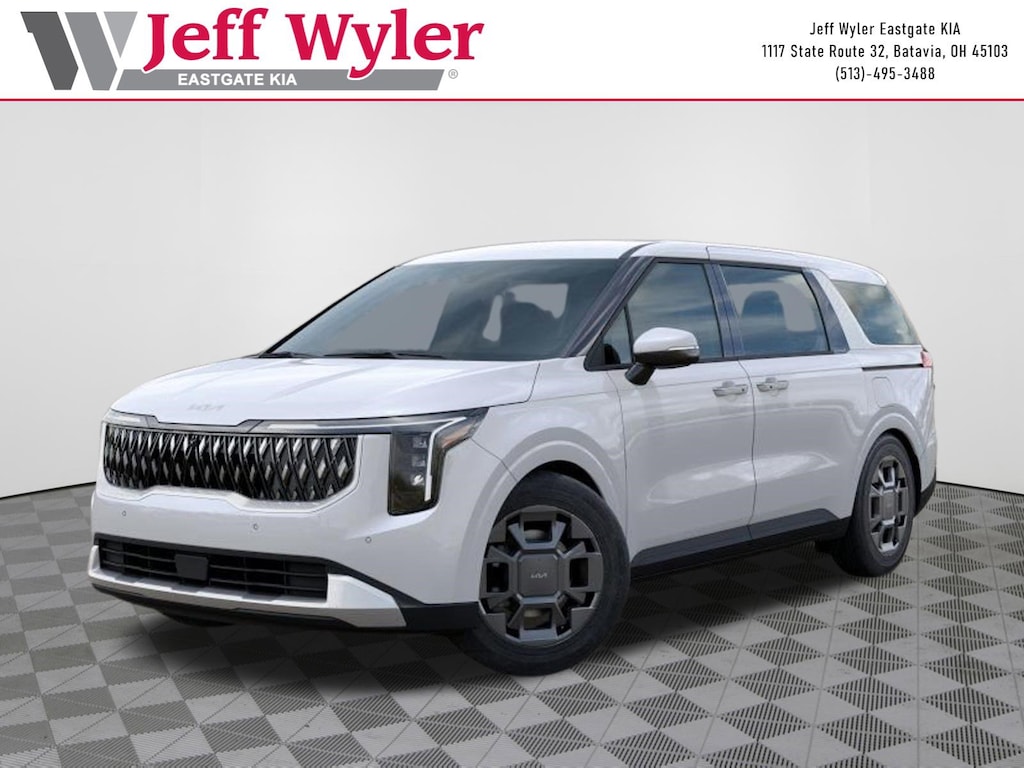 Snow White Pearl 2026 Kia Carnival Hybrid EX 1.6L I4 DGI Hybrid Turbocharged DOHC 16V LEV3-SULEV30 FWD 6-Speed Automatic 34/31 City/Highway MPG Jeff Wyler Eastgate Auto Mall is pumped up to offer this handsome 2026 Kia Carnival Hybrid EX in Snow White Pearl. Well equipped with: 3rd row seats: split-bench, 4-Wheel Disc Brakes, 8 Speakers, ABS brakes, Air Conditioning, All Weather Floor Mats (8-Passenger), Alloy wheels, AM/FM radio: SiriusXM, Apple CarPlay & Android Auto, Artificial Leather Seat Trim, Auto High-beam Headlights, Auto-Dimming Mirror with HomeLink, Automatic temperature control, Brake assist, Bumpers: body-color, Compass, Delay-off headlights, Driver door bin, Driver vanity mirror, Dual front impact airbags, Dual front side impact airbags, Electronic Stability Control, Emergency communication system, Exterior Parking Camera Rear, Four wheel independent suspension, Front anti-roll bar, Front Bucket Seats, Front Center Armrest, Front dual zone A/C, Front reading lights, Fully automatic headlights, Heated door mirrors, Heated Front Bucket Seats, Heated front seats, Illuminated entry, Knee airbag, Leather Shift Knob, Leather steering wheel, Low tire pressure warning, Memory seat, Navigation System, Occupant sensing airbag, Outside temperature display, Overhead airbag, Overhead console, Panic alarm, Passenger door bin, Passenger vanity mirror, Power door mirrors, Power driver seat, Power Liftgate, Power passenger seat, Power steering, Power windows, Radio: : Navigation System with SiriusXM, Rear air conditioning, Rear anti-roll bar, Rear reading lights, Rear window defroster, Rear window wiper, Reclining 3rd row seat, Remote keyless entry, Security system, Speed control, Speed-sensing steering, Split folding rear seat, Spoiler, Steering wheel mounted audio controls, Tachometer, Telescoping steering wheel, Tilt steering wheel, Traction control, Trip computer, Turn signal indicator mirrors, Variably intermittent wipers, and Wheels: 19" Black Alloy. 34/31 City/Highway MPG